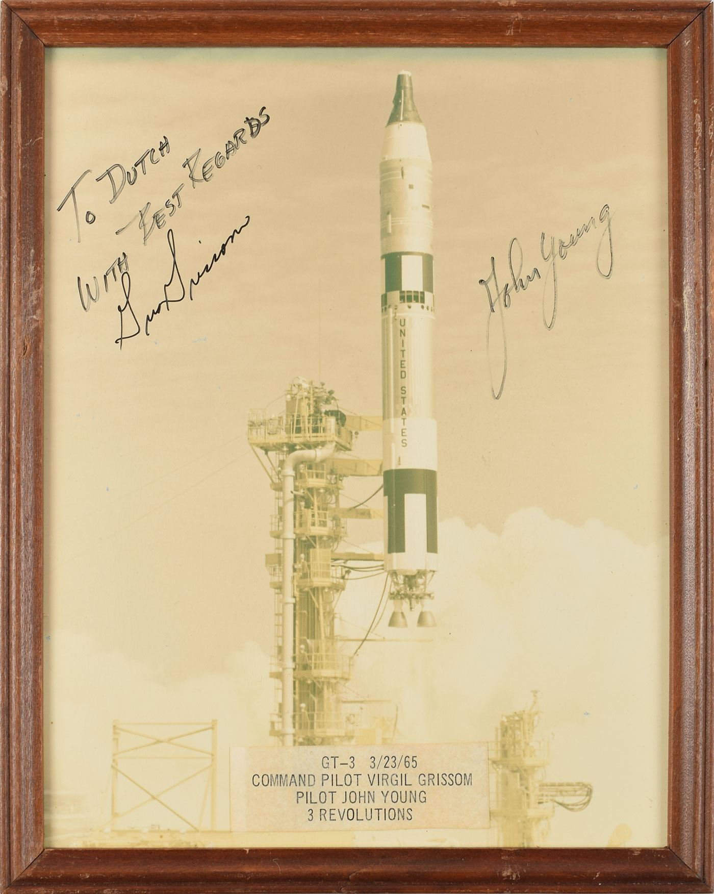 Fantastic color vintage semi-glossy 7 x 8.75 photo of the launch of the Titan II rocket transporting the crew of Gemini 3, signed and inscribed in black felt tip, "To Dutch, with Best Regards, John Young" and "Gus Grissom." Framed and in very good to fine condition, with crazing and fading to the signed photo; the signatures remain bold and prominent.