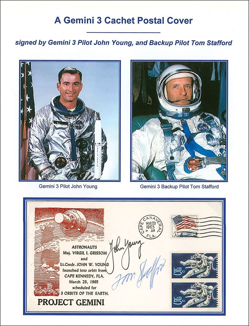 Commemorative postal cover with a raised color cachet honoring the Gemini 3 mission, postmarked with a launch date of March 23, 1965, signed in black ink by John Young and in blue ballpoint by Tom Stafford. Presented on a color 8.5 x 11 informational sheet. In fine condition.