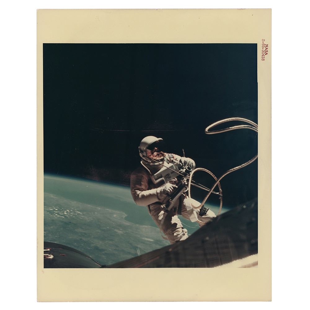 Historic official color glossy 8 x 10 red-numbered NASA photo (S-65-30428), showing Ed White during his Gemini 4 EVA, during which he became the first American astronaut to perform a spacewalk. This remarkable image shows White with Earth in the background, connected to the capsule only by his 25-foot umbilical line and tether. Reverse bears "A Kodak Paper" watermarks. In very good to fine condition, with scuffing to the image.