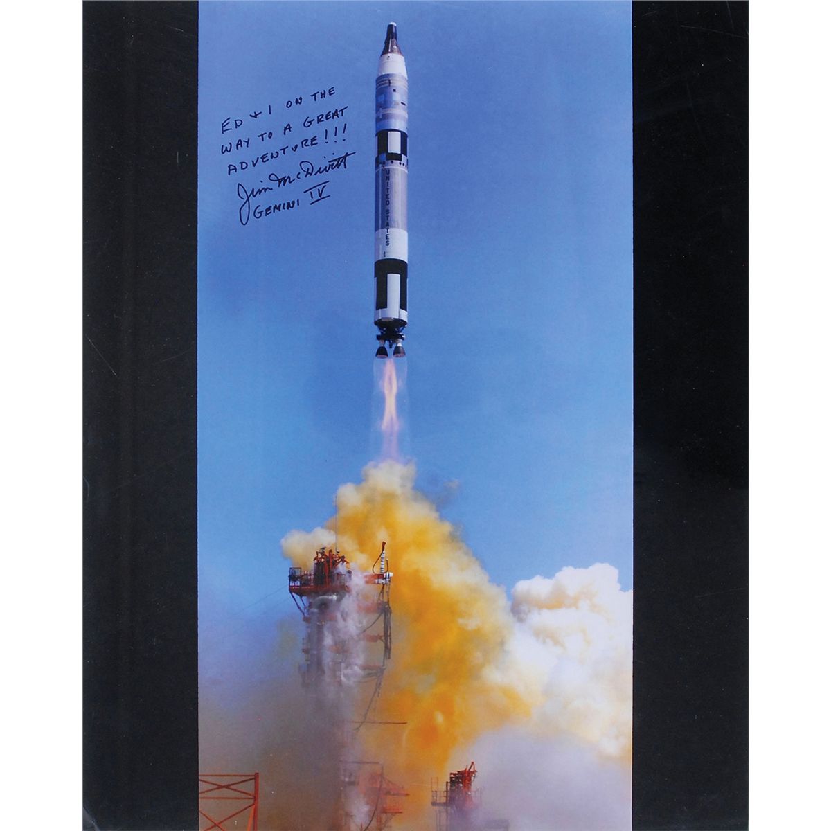 Color satin-finish 16 x 20 photo of the lift-off of Gemini 4, signed in black felt tip, “Ed & I on the way to a great adventure!!! Jim McDivitt, Gemini IV.” In fine condition. From the toured space collection of Leslie Cantwell.