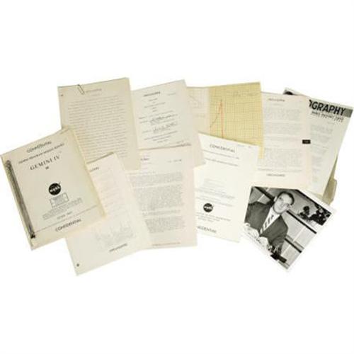 <B>Gemini 4 Mission Archive.</B></I> Gemini 4 was a 1965 manned space flight by James McDivitt and Edward White to show that it was possible for humans to remain in space for the length of time required to fly the moon and back. And although not originally scheduled for this mission, Gemini 4 would also see the first ever American Extra-vehicular activity (space walk). Included here is a collection of official NASA data on the Gemini 4 mission, including the Mission Report and a file folder containing miscellaneous Gemini 4 preflight and medical information belonging to Dr. Coons, with a transcript of a medical debriefing between a NASA doctor and the two mission pilots. Also included with this lot is a black and white 8" x 10" photo of Dr. Coons, as well as an official one page NASA biography of him. All items in this assortment are in excellent condition. <I>From the estate of Dr. D. Owen Coons, Chief of NASA's Manned Spacecraft Center Medical Office.</B></I><BR><BR><b>Shipping:</b> Books & Catalogs (<a target="_blank" href="http://www.heritageauctions.com/common/shipping.php">view shipping information</a>) <BR><BR><B>Important notice:</