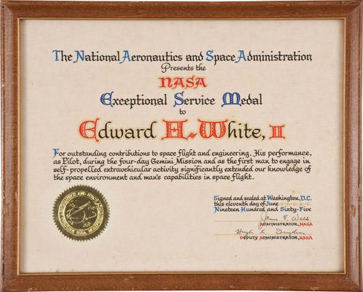 ''Exceptional Service Medal'' certificate presented by NASA to Ed White II in 1965, obtained directly from his personal collection and accompanied by a signed certificate of authenticity from Ed White III. Beautifully rubricated and illuminated certificate reads, ''The National Aeronautics and Space Administration Presents the NASA Exceptional Service Medal to Edward H. White / For outstanding contributions to space flight and engineering. His performance as Pilot, during the four-day Gemini Mission and as the first man to engage in self-propelled extravehicular activity significantly extended our knowledge of the space environment and man's capabilities in space flight.'' Signed by NASA Administrator James E. Webb, certificate features NASA seal at lower left. Measures 13.5'' x 10.5'', in very good condition. Actual medal is not present. Also included in the lot are two photos taken at the medal presentation ceremony at Washington, D.C. on 17 June 1965, as follows: (1) a color 8'' x 10'' photo of President Johnson standing between McDivitt and White on the White House steps. Both astronauts are wearing their medals; and (2) a black and white 10'' x 8'' photo with NASA caption on the verso showing President Johnson pinning the medal on White's lapel. Fellow Gemini 4 astronaut James McDivitt is clearly seen in the photo with his matching Exceptional Service Medal citation.