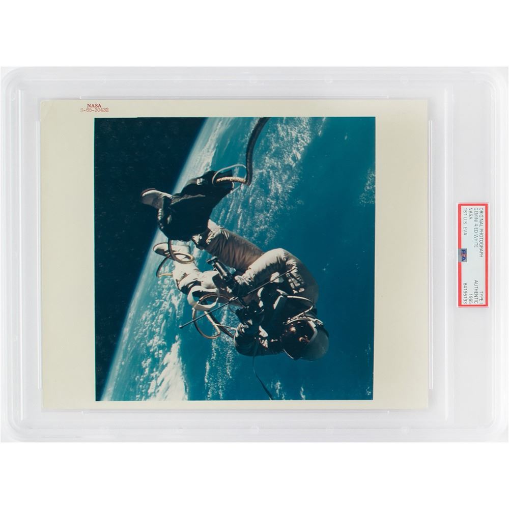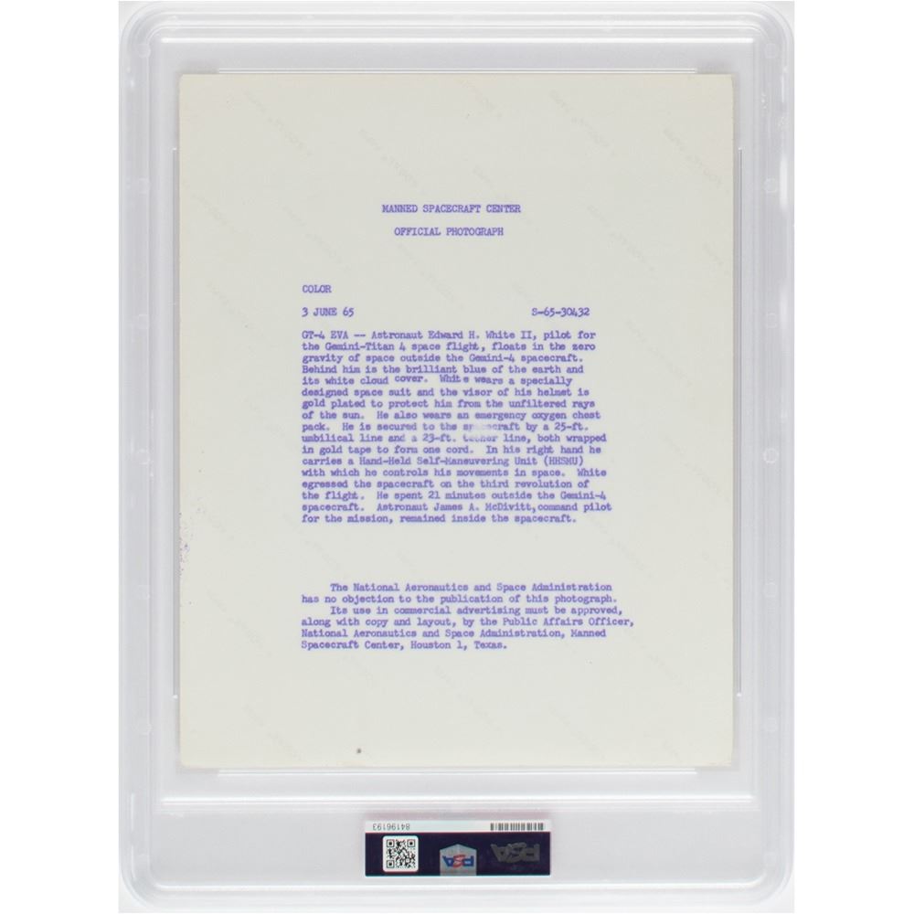 Official color glossy 10 x 8 red-numbered NASA photo (S-65-30432), which shows astronaut Ed White floating in space performing his historic first American EVA during Gemini 4. Reverse bears "A Kodak Paper" watermarks and purple NASA caption text. In fine condition. Encapsulated by PSA as an authentic 'Type I' photograph.