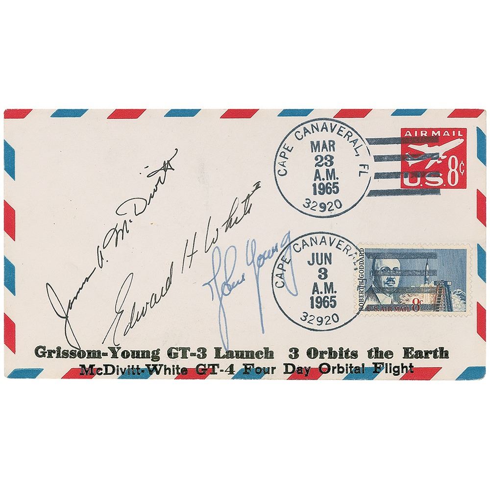 Commemorative ‰Û÷launch day‰Ûª cover postmarked on March 23, 1965, the date of the Gemini 3 mission, and again on June 3, 1965, the date of the Gemini 4 mission, signed in black ink, ‰ÛÏEdward H. White II‰Û and ‰ÛÏJames A. McDivitt.‰Û The cover also bears an autopen signature of astronaut John Young. In very fine condition. Accompanied by a full letter of authenticity from Zarelli Space Authentication.