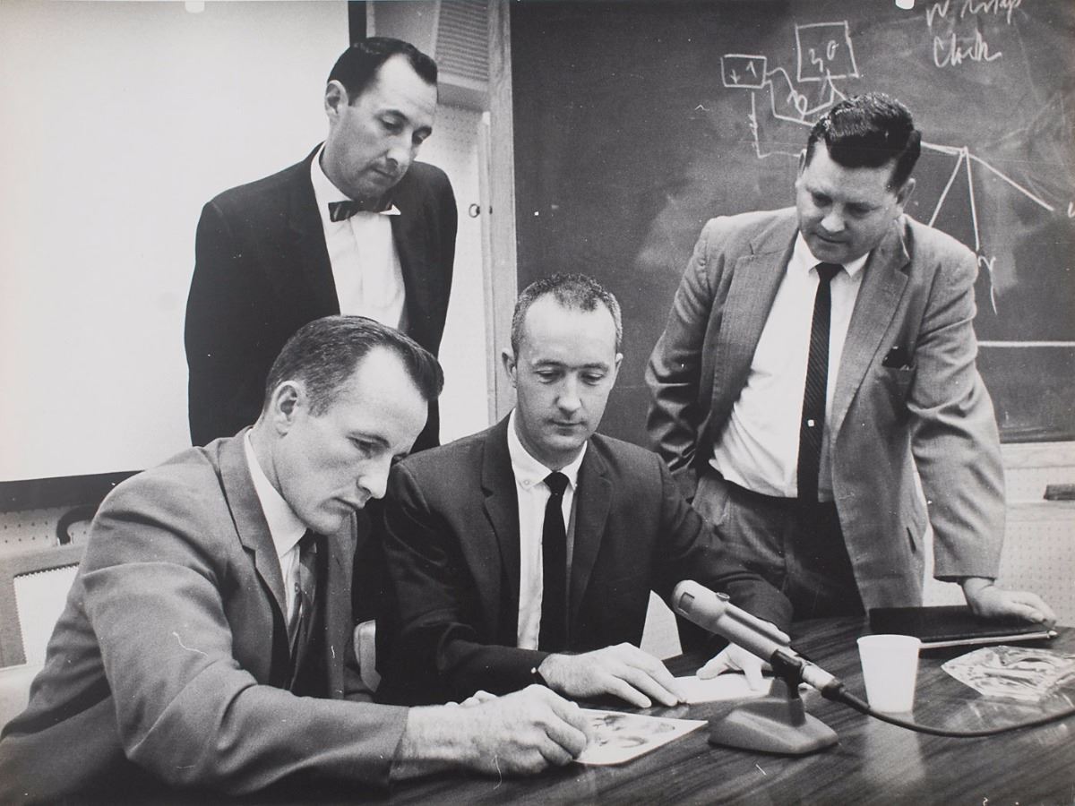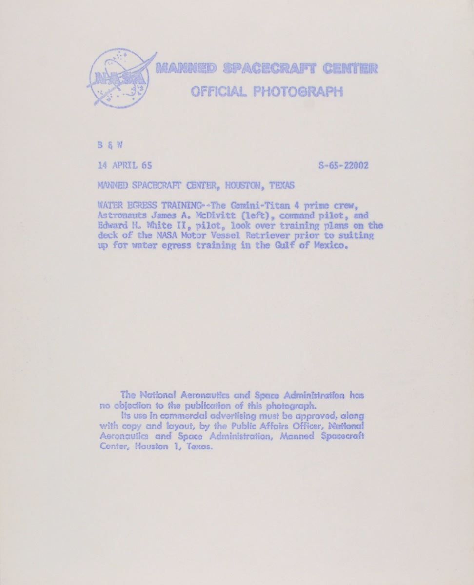 Vintage official glossy 8 x 10 NASA photo of James McDivitt and Ed White looking over training plans while preparing for water egress training, signed in blue ballpoint by both. Reverse bears purple NASA caption text. Light scattered creases and some skipping to ink, otherwise fine condition. Originally from the collection of aerospace reporter Howard Benedict, acquired by him during an interview in 1965; accompanied by a period glossy photo showing Benedict looking over the shoulders of the astronauts as they sign this exact photo.