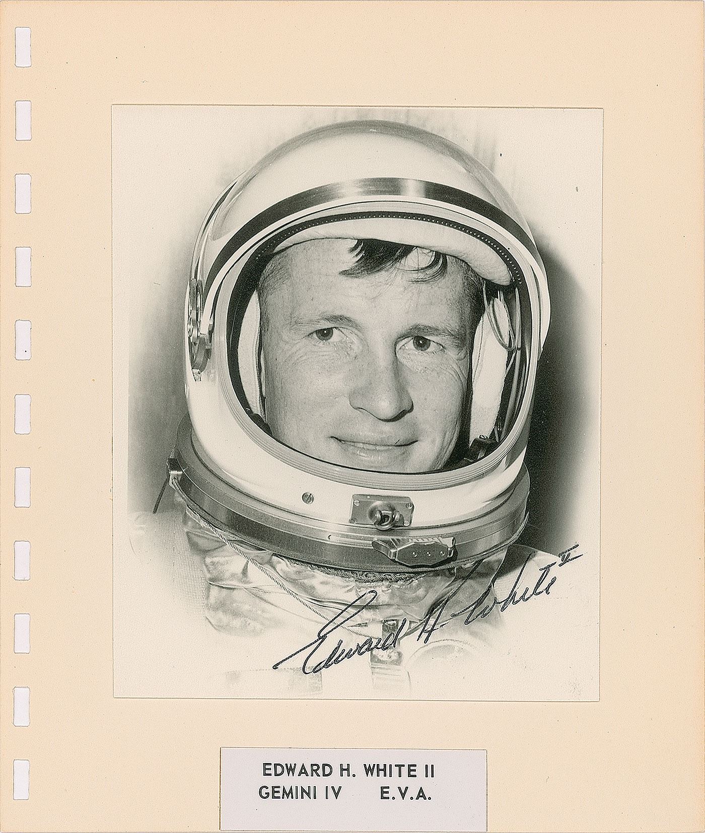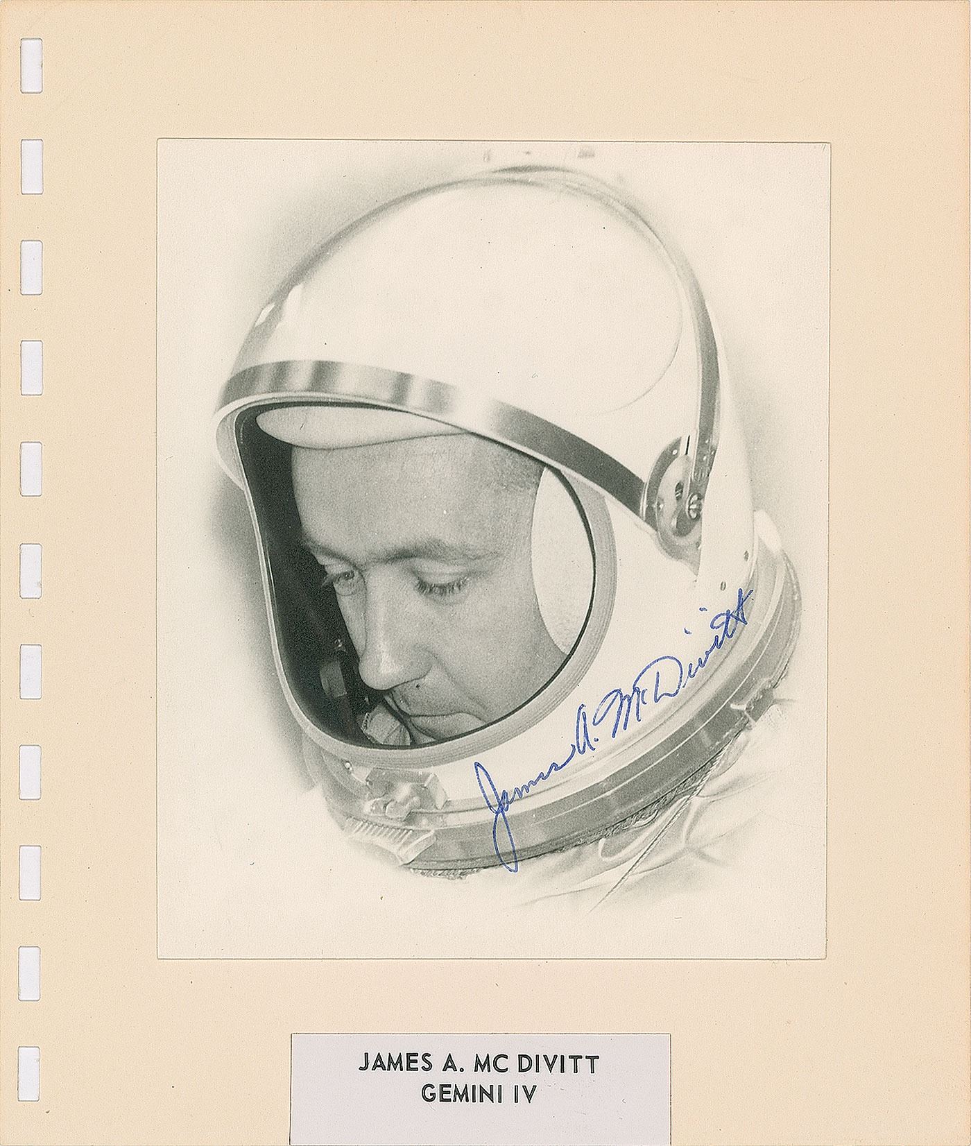 Two matte-finish 3.75 x 4.5 close-up photos of the crew of Gemini 4, signed in ballpoint by the pictured astronaut: "James A. McDivitt" and "Edward H. White II." Both photos are individually affixed to off-white 5.5 x 6.25 notebook pages. In overall fine condition.