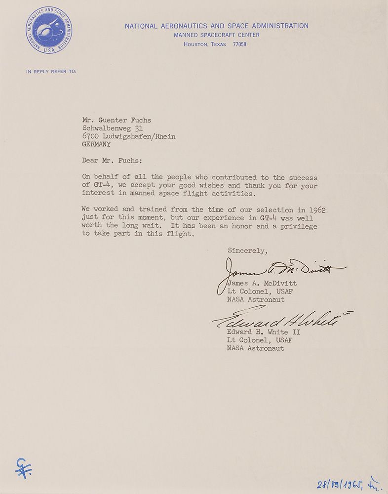TLS signed “James A. McDivitt” and “Edward H. White II,” one page, 8 x 10.25, NASA letterhead, undated but received September 28, 1965. Letter to a German admirer. In full: “On behalf of all the people who contributed to GT-4, we accept your good wishes and thank you for your interest in manned space flight activities. We worked and trained from the time of our selection in 1962 just for this moment, but our experience in GT-4 was well worth the long wait. It has been an honor and a privilege to take part in this flight.” In fine condition, with ink notations to the lower border by the original recipient.