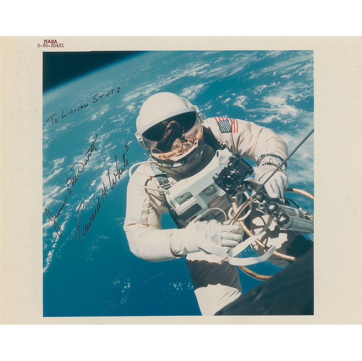 Color vintage glossy 10 x 8 ‘red-numbered’ NASA photo, signed in black ink, “James A. McDivitt” and “Edward H. White II,” and inscribed in an unknown hand, “To Lillian Stutz.” In fine condition, with trivial dings to upper left corner. A unique and desirable image of Ed White’s spacewalk on June 3, 1965.
