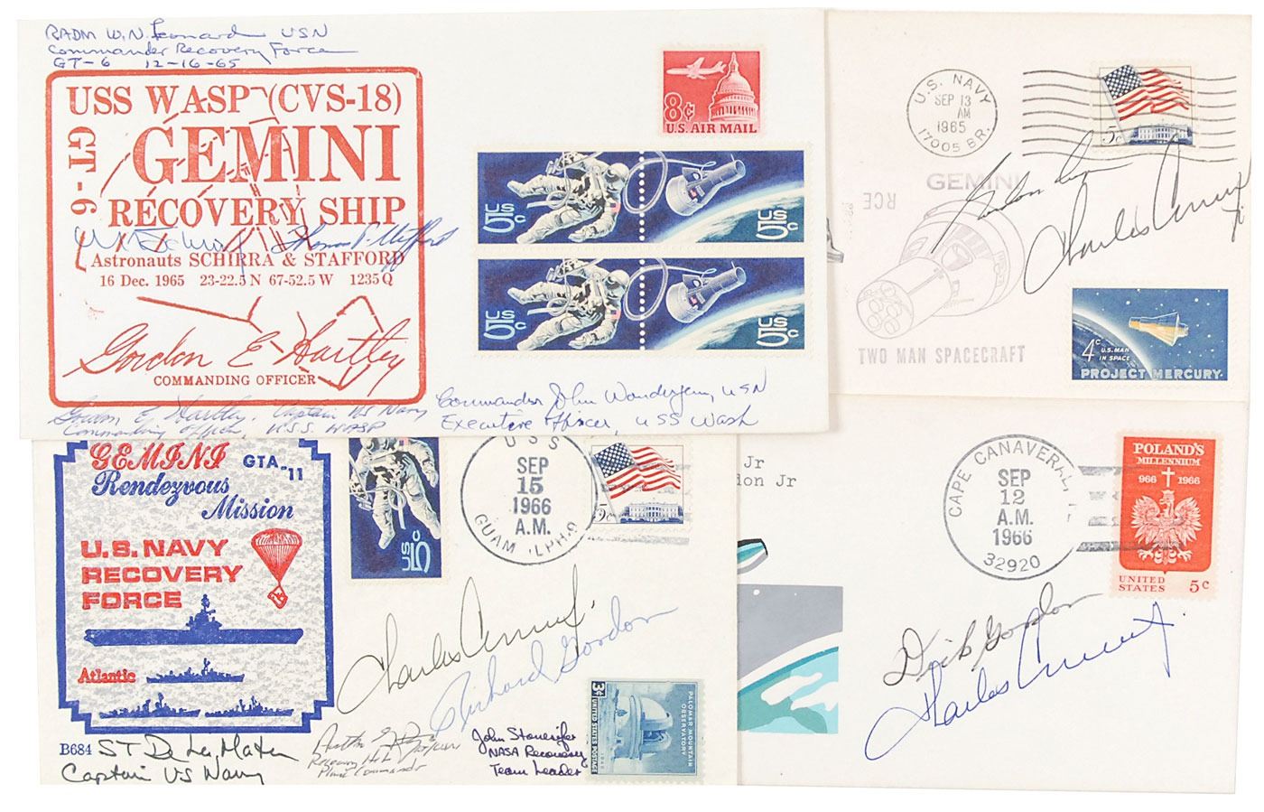 Collection of four covers with cachets honoring various Gemini missions and recoveries, signed in blue and black ballpoint by the participants, including: Gemini 5, signed by Gordon Cooper and Charles Conrad; Gemini 6 recovery, signed by Wally Schirra, Thomas Stafford, and four officers of the recovery ship; Gemini 11, signed by Dick Gordon and Charles Conrad; and Gemini 11 recovery, signed by Gordon, Conrad, and three members of the recovery team. In overall fine condition.