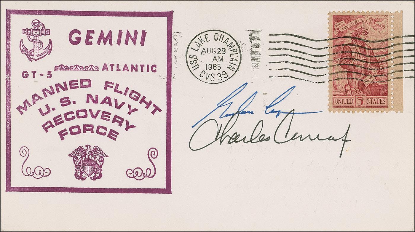 Gemini 5 prime recovery cover with a cachet honoring the naval recovery force of Gemini 5, signed in blue ink by Gordon Cooper and in black ink by Charles Conrad. In fine condition, with light remnants of an erased address.