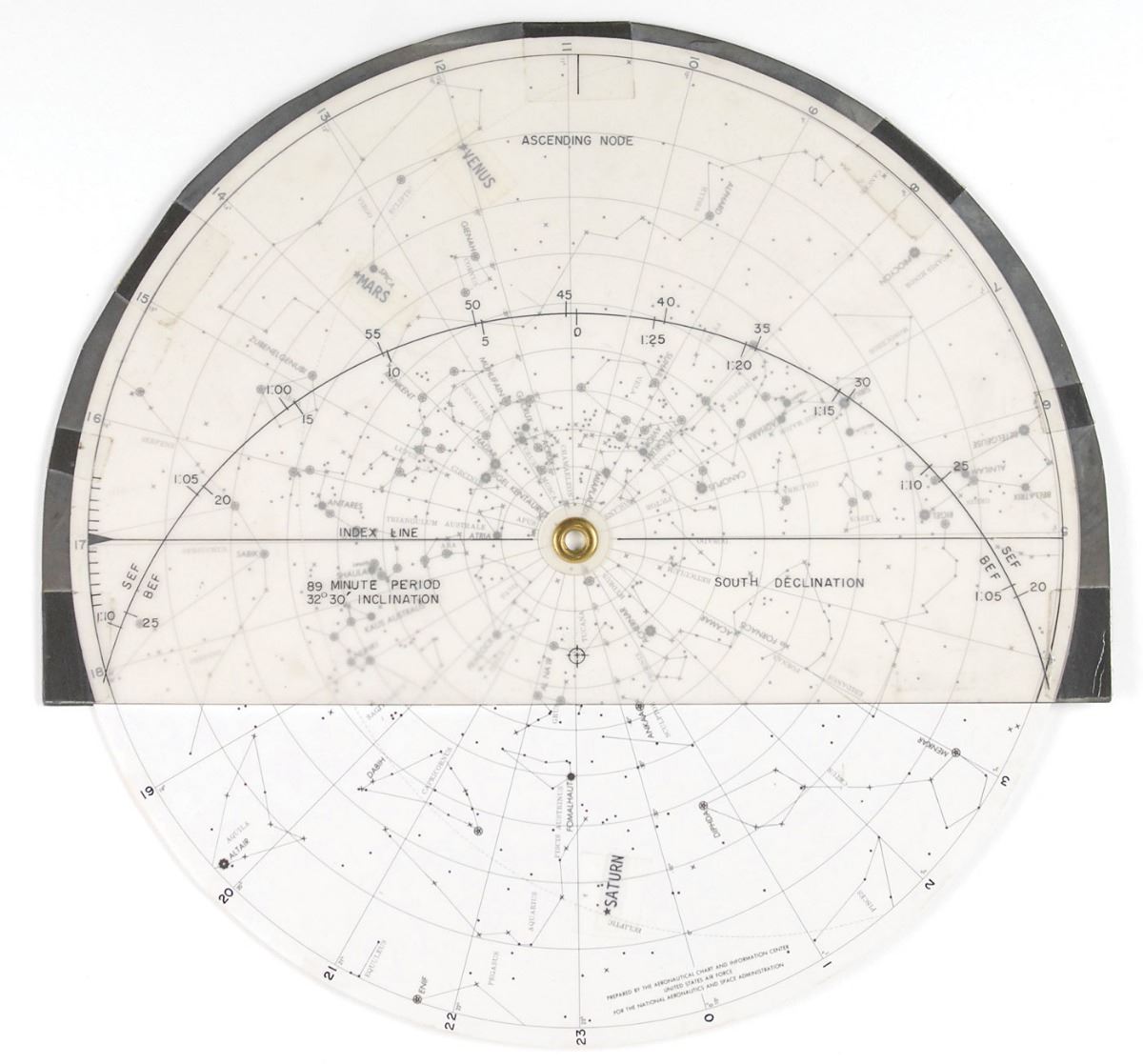 Flown star chart carried on board the Gemini 5 mission from August 21–28, 1965. Chart measures approximately 9.75? in diameter and is labeled, “CF55062-I Serial No. 54.” All major stars, planets, and constellations visible from orbit are plotted underneath a rotating translucent position locator and include the moon, Venus, Mars, Saturn, Jupiter, the Sun, Virgo, and Libra. In fine condition, with some expected wear and tape from use. Accompanied by a signed certificate of authenticity from Charles Conrad, in part: “This is to certify that the star chart…CF55062-1 Serial No. 54…was flown onboard Gemini 5 with Astronauts Charles P. Conrad and L. Gordon Cooper.” Cooper has also signed the certificate in black ink, “8 Days or Bust! Gordon Cooper, Commander Gemini V.” Also accompanied by a photo of Cooper holding the chart and certificate. Backed by its strong provenance, this is a rare navigational tool crucial to the safe and successful journey of the third manned Gemini flight.