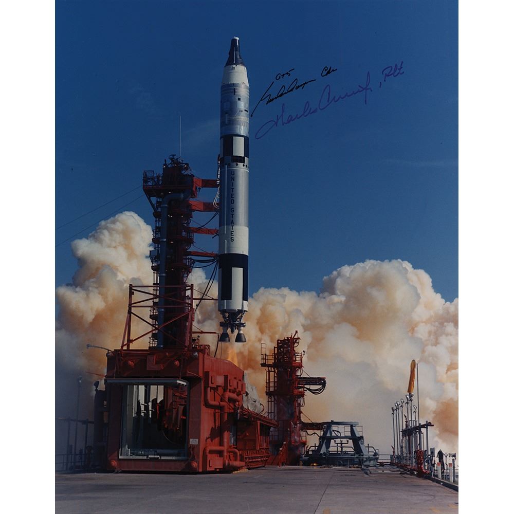 Dramatic color satin-finish 11 x 14 photo of the launch of Gemini 5 from Pad 19 on August 21, 1965, signed in black felt tip, "GT5, Gordon Cooper Cdr.," and in blue felt tip, "Charles Conrad, Jr., Plt." In very fine condition.