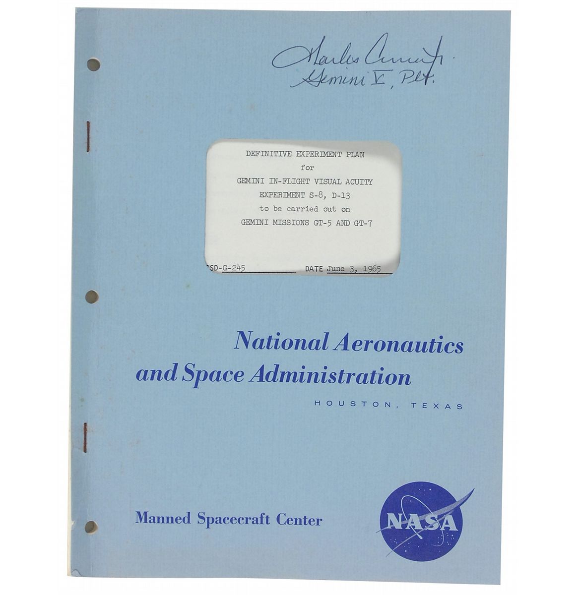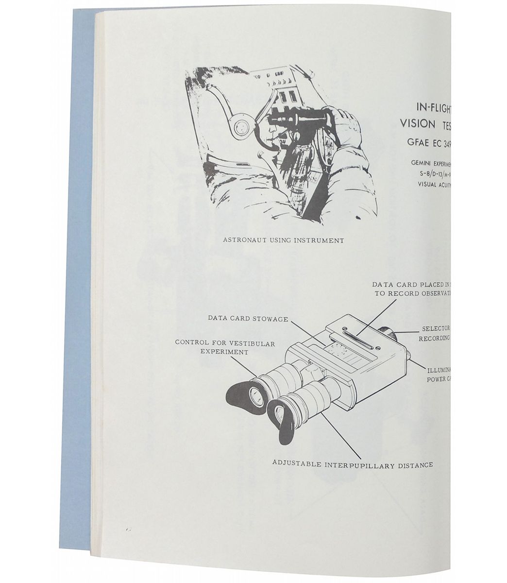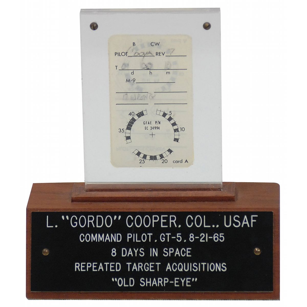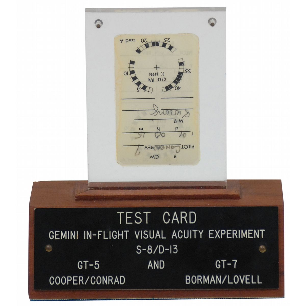 Flown eye test date card carried on board Gemini 5. Double-sided laminated card measures 1.5 x 2.5 and was for the “In-flight Visual Acuity Experiment S-8/D-13,” performed by Pete Conrad and Gordon Cooper. Conrad’s side of the card is filled out during the seventh revolution, one day and 15 minutes into the flight, with Conrad getting “8 wrong.” Cooper took the test on the same day, five minutes earlier than Conrad and got “12 wrong.” Card is presented on a 4.5 x 15.5 x 2.5 walnut base with informational plaques on both sides. Accompanied by an original NASA manual for the experiment, signed on the front cover in black ink, “Pete Conrad, Gemini V, Plt.” Also accompanied by a photocopy of an October 19, 1972, story from the Galveston Daily News about the card. In fine condition. The included article talks about how the Government investigated the ownership of the card back in 1972. This represents one of the first attempts by the Government to replevin a flown artifact that was in the possession of an astronaut. In this case, Gordon Cooper, gifted the eye chart to his friend. Any flown experiments, particularly with recorded data, are quite desirable.