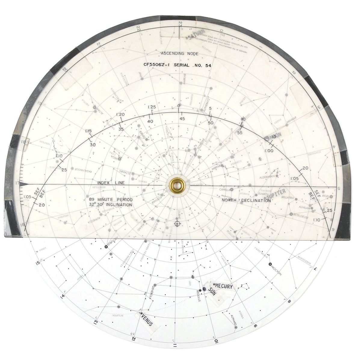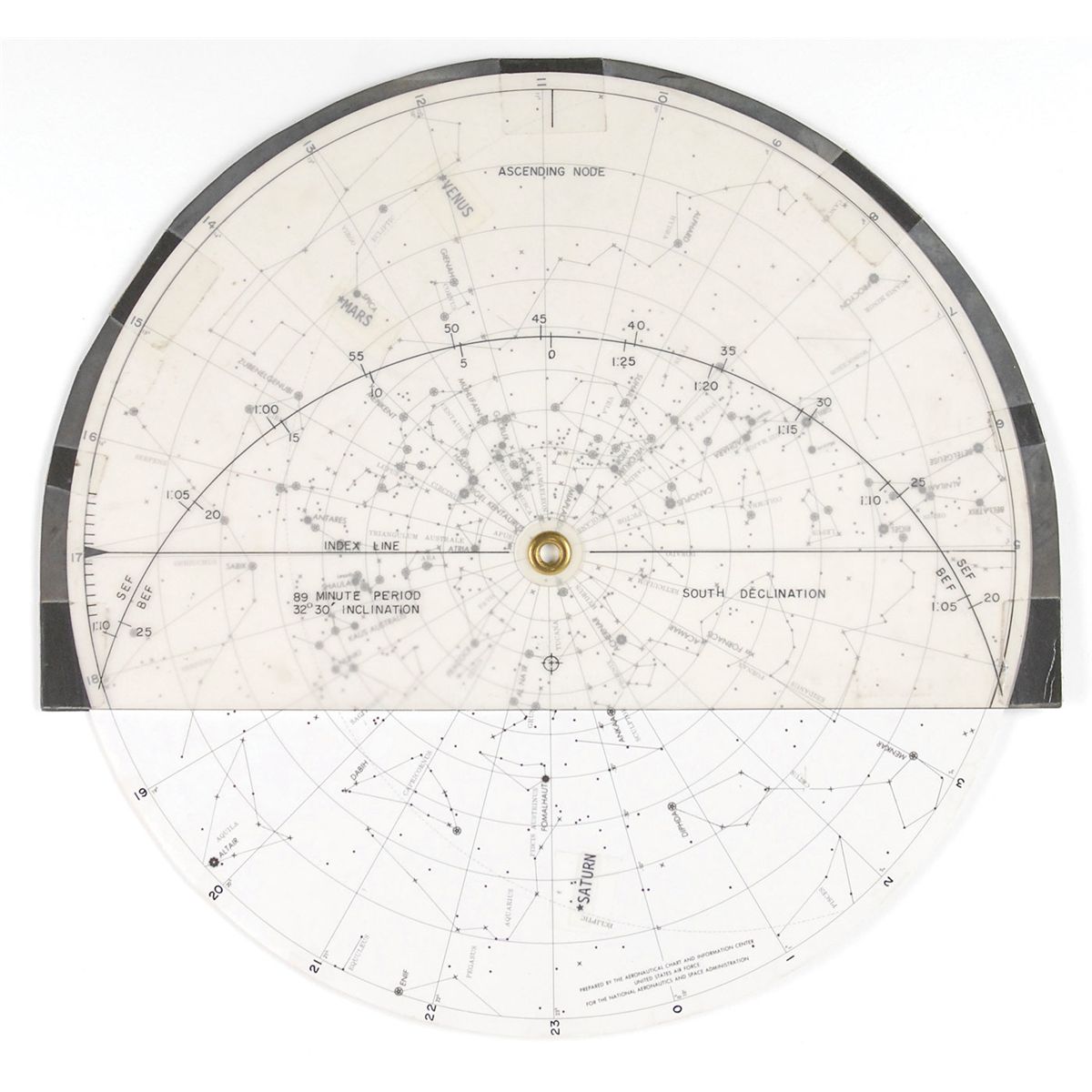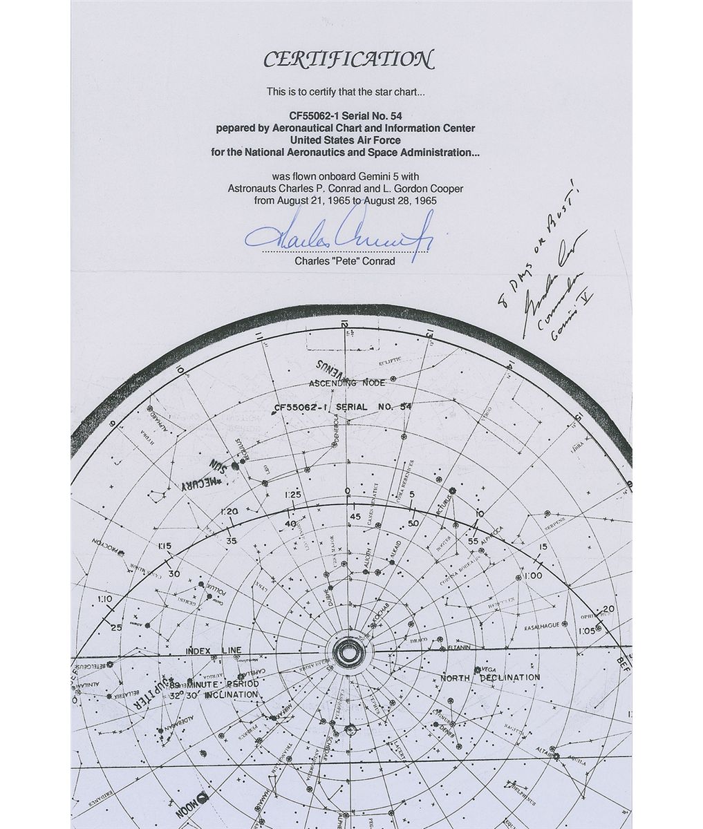 Flown star chart carried on board the Gemini 5 mission. Chart measures approximately 9.75? in diameter and is labeled, “CF55062-I Serial No. 54.” All major stars, planets, and constellations visible from orbit are plotted underneath a rotating translucent position locator and include the moon, Venus, Mars, Saturn, Jupiter, the Sun, Virgo, and Libra. Accompanied by a certificate of authenticity from Charles Conrad which reads, in part: “CF55062-1 Serial No. 54…was flown onboard Gemini 5 with Astronauts Charles P. Conrad and L. Gordon Cooper.” Cooper has also signed the certificate, “8 Days or Bust! Gordon Cooper, Commander Gemini V.” Also included is a photo of Cooper holding the chart and certificate. In fine condition. A rare navigational tool from an important Gemini mission.