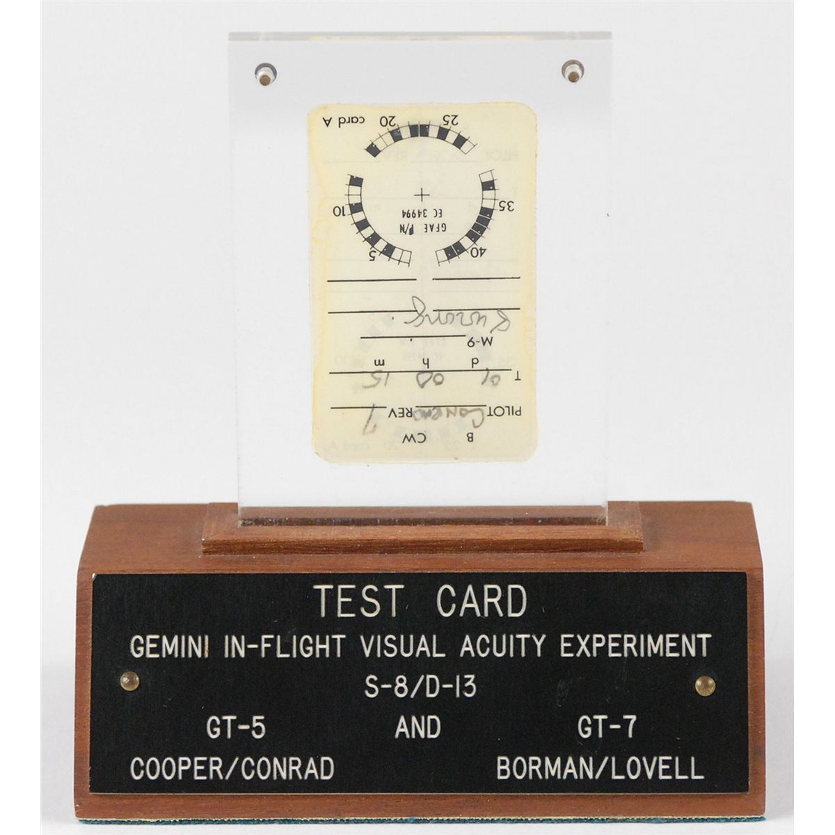 Flown eye test date card carried on board Gemini 5. Double-sided laminated card measures 1.5 x 2.5 and was for the “In-flight Visual Acuity Experiment S-8/D-13,” performed by Pete Conrad and Gordon Cooper. Conrad’s side of the card is filled out during the seventh revolution, one day and 15 minutes into the flight, with Conrad getting “8 wrong.” Cooper took the test on the same day, five minutes earlier than Conrad and got “12 wrong.” Card is presented on a 4.5 x 15.5 x 2.5 walnut base with informational plaques on both sides. Accompanied by an original NASA manual for the experiment, signed on the front cover in black ink, “Charles Conrad, Jr., Gemini V, Plt.” In fine condition. Also accompanied by a photocopy of an October 19, 1972, story from the Galveston Daily News about the card and the government’s investigation of the ownership. This represents one of the first attempts by the government to reclaim a flown artifact that was in the possession of an astronaut, in this case, Gordon Cooper, who gifted the eye chart to his friend. Any flown experiments, particularly with recorded data, are quite desirable.