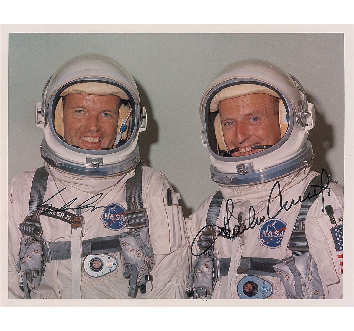 Color satin-finish 10 x 8 photo of the Gemini 5 crew in their white space suits, signed in black felt tip by Gordon Cooper and Charles Conrad. In fine condition, with some unobtrusive surface impressions. From the Leon Ford Collection.