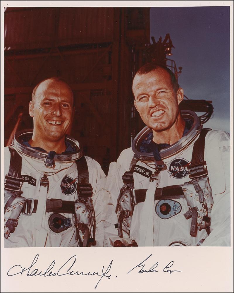 Color glossy 8 x 10 photo of Gemini 5 astronauts Charles Conrad and Gordon Cooper posing together at the launch pad, signed in the lower border in black felt tip by both Conrad and Cooper. In very fine condition. Pre-certified Scott Cornish and RRAuction COA.