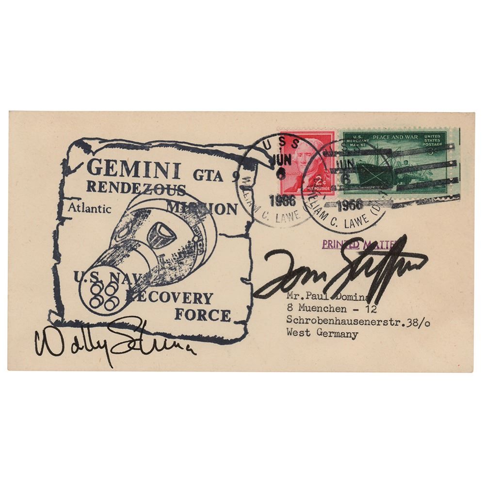 Recovery cover with a stamped cachet honoring the Gemini 9 recovery in the Atlantic Ocean, postmarked on the USS William C. Lawe on June 6, 1966, signed in black felt tip by Gemini 6 co-pilots Tom Stafford and Wally Schirra. In fine condition.