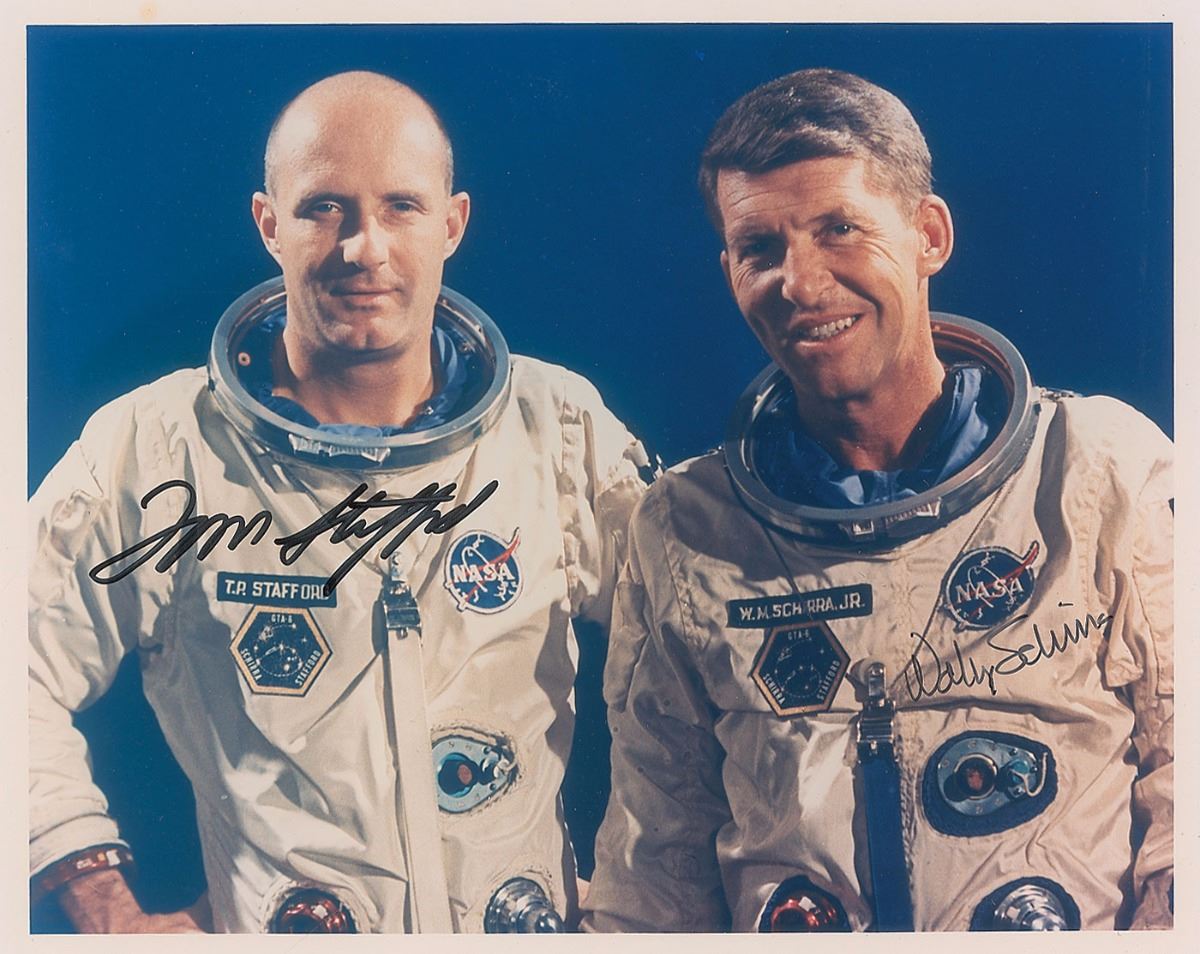 Color satin-finish 10 x 8 photo of the Gemini 6 crew posing in their white spacesuits, signed in black felt tip by Tom Stafford, and in black ink by Wally Schirra. Reverse bears a Spacesource label in the lower right corner. In fine condition, with a faint vertical surface impression along right edge, and a trivial spot of soiling to upper border.
