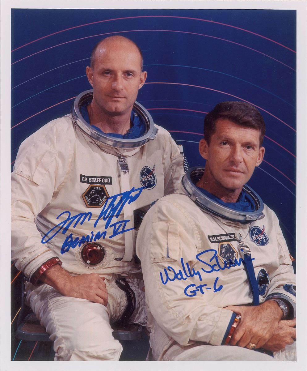 Color semi-glossy 8 x 10 photo of the crew of the fourth manned Gemini mission, signed in blue felt tip, "Tom Stafford, Gemini VI" and "Wally Schirra, GT-6." In fine condition. Pre-certified Zarelli Space Authentication.