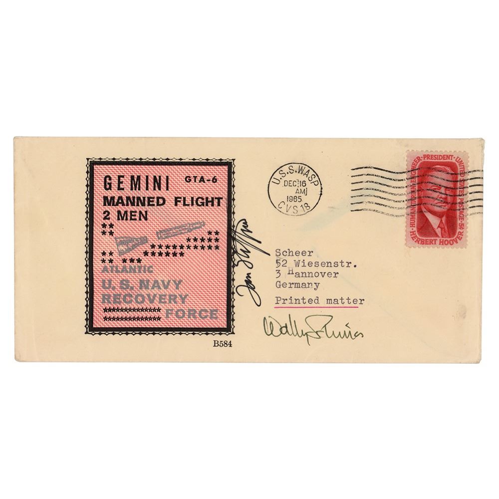 Uncommon 'splashdown' cover, 7.5 x 3.5, with a color cachet honoring the U.S. Navy Atlantic Recovery Force that retrieved the crew of the Gemini 6 mission, postmarked aboard the USS Wasp on December 16, 1965, signed in black ink by Wally Schirra and Tom Stafford. In very good to fine condition, with creasing along the side edges. Accompanied by a vintage NASA booklet for the "Gemini 6 Mission."