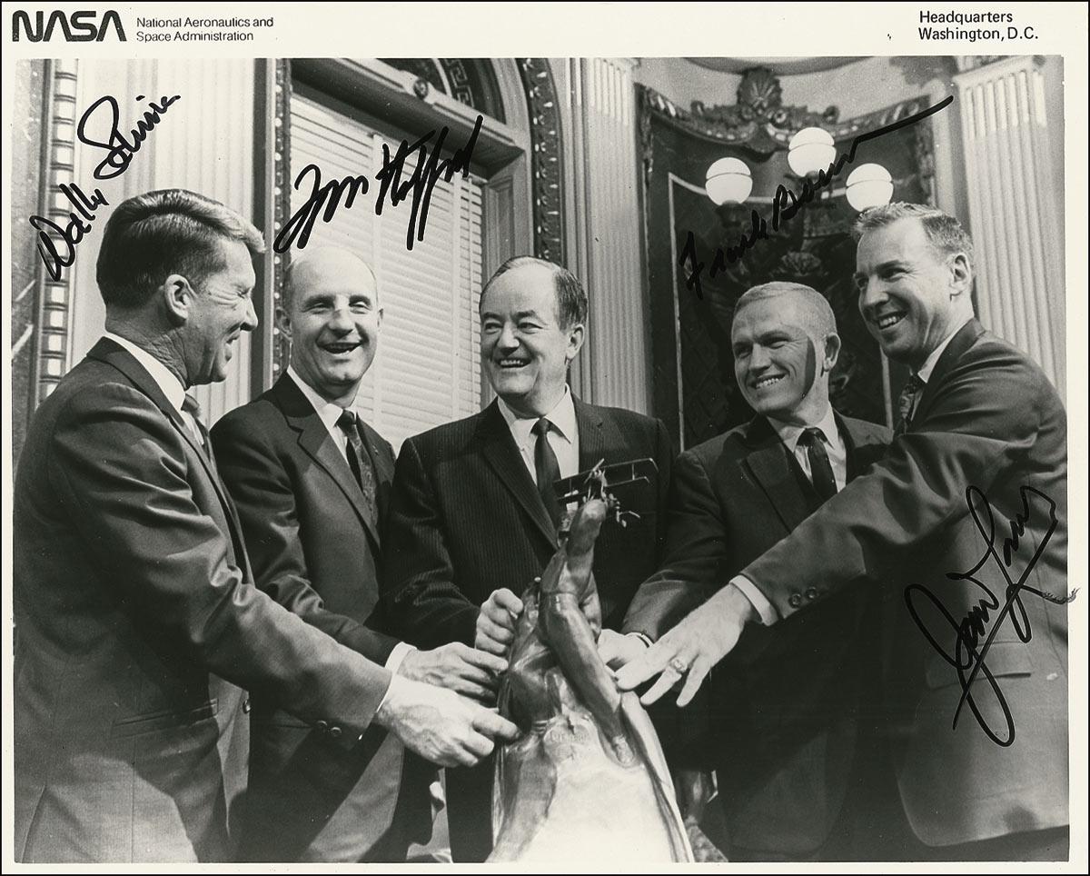 Glossy 10 x 8 NASA photo of the Gemini 6 and 7 astronauts with Vice President Humphrey presenting the Harmon Aviation trophy to the astronauts, signed in black felt tip by Wally Schirra, Tom Stafford, James Lovell, and Frank Borman. In fine condition, with a few scattered light surface marks. Accompanied by a vintage ink signature of Hubert Humphrey on an off-white 5 x 3 card. Pre-certified Scott Cornish and RRAuction COA.