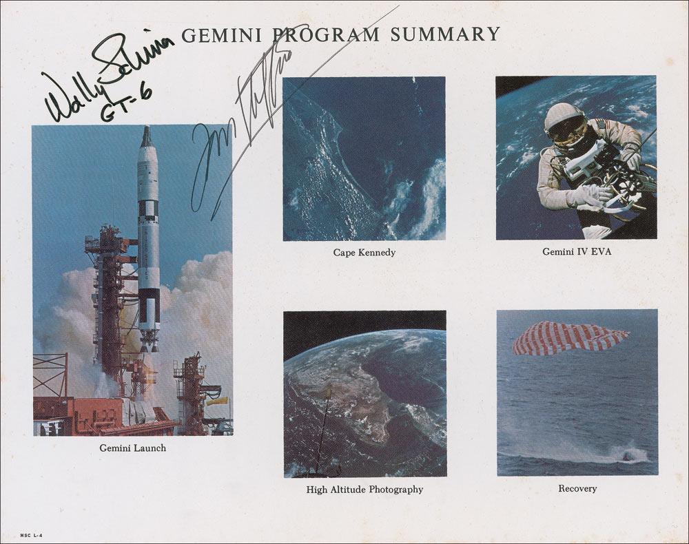 Color 10 x 8 NASA composite photo of the Gemini program summary, signed in black felt tip by Wally Schirra and Tom Stafford. In fine condition, with a bit of scattered light foxing.