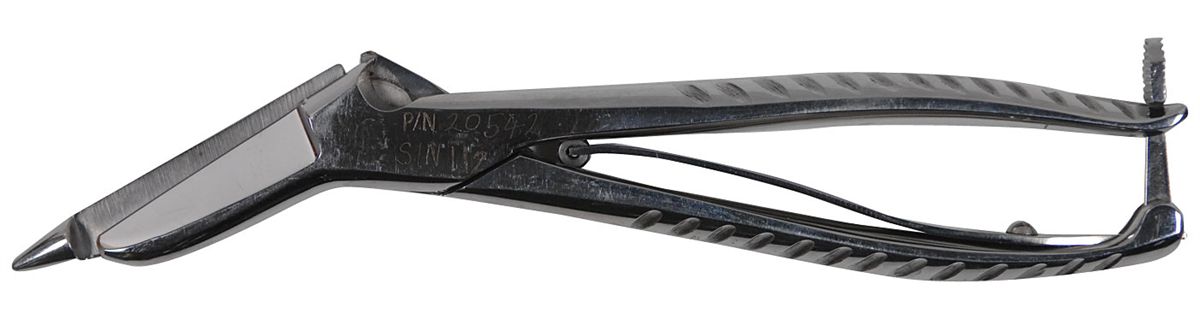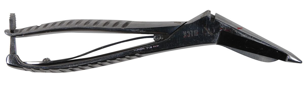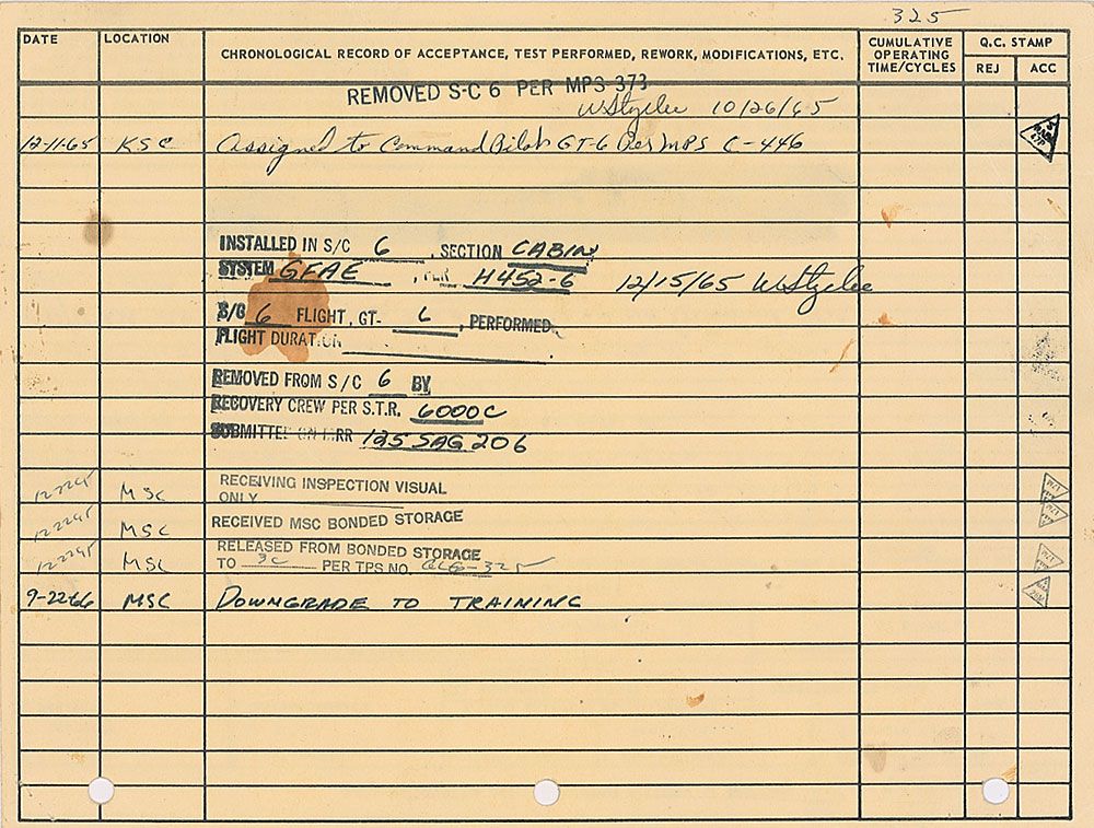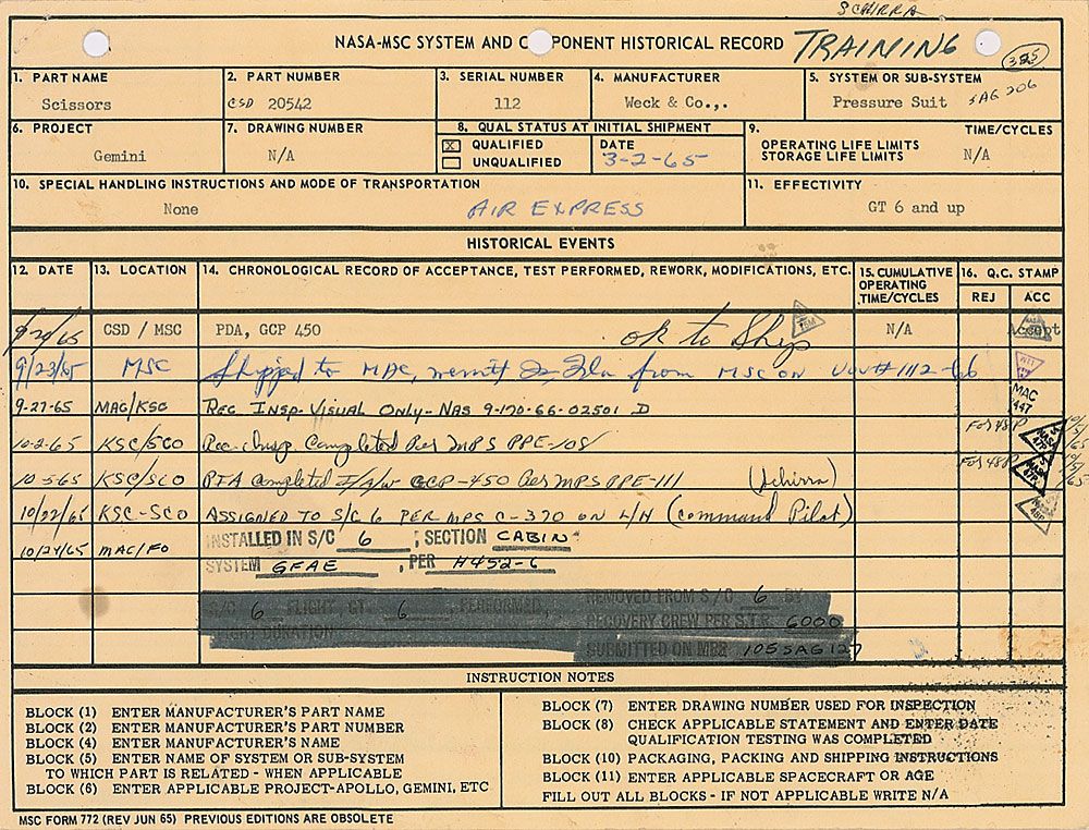 Flown surgical scissors carried on board the Gemini 6 mission. Heavy and sturdy stainless steel scissors, manufactured by Weck and Company, measure 8? long, and are engraved on one side, “P/N 20542, S/N 112.” Scissors are kept closed by a locking mechanism at the bottom of the handle. Accompanied by a NASA-MSC System and Component Historical Record sheet, filled in by several technicians following the complete history of the scissors beginning with their shipment on September 23, 1965 their assignment to :”S/C 6…Command Pilot”; their installation on Gemini 6; the placement in the cabin on December 11, 1965; its return and removal; and placement in bonded storage and downgrade to training. In fine condition. Although designed for many uses, the primary function of the scissors was to open food pouches.