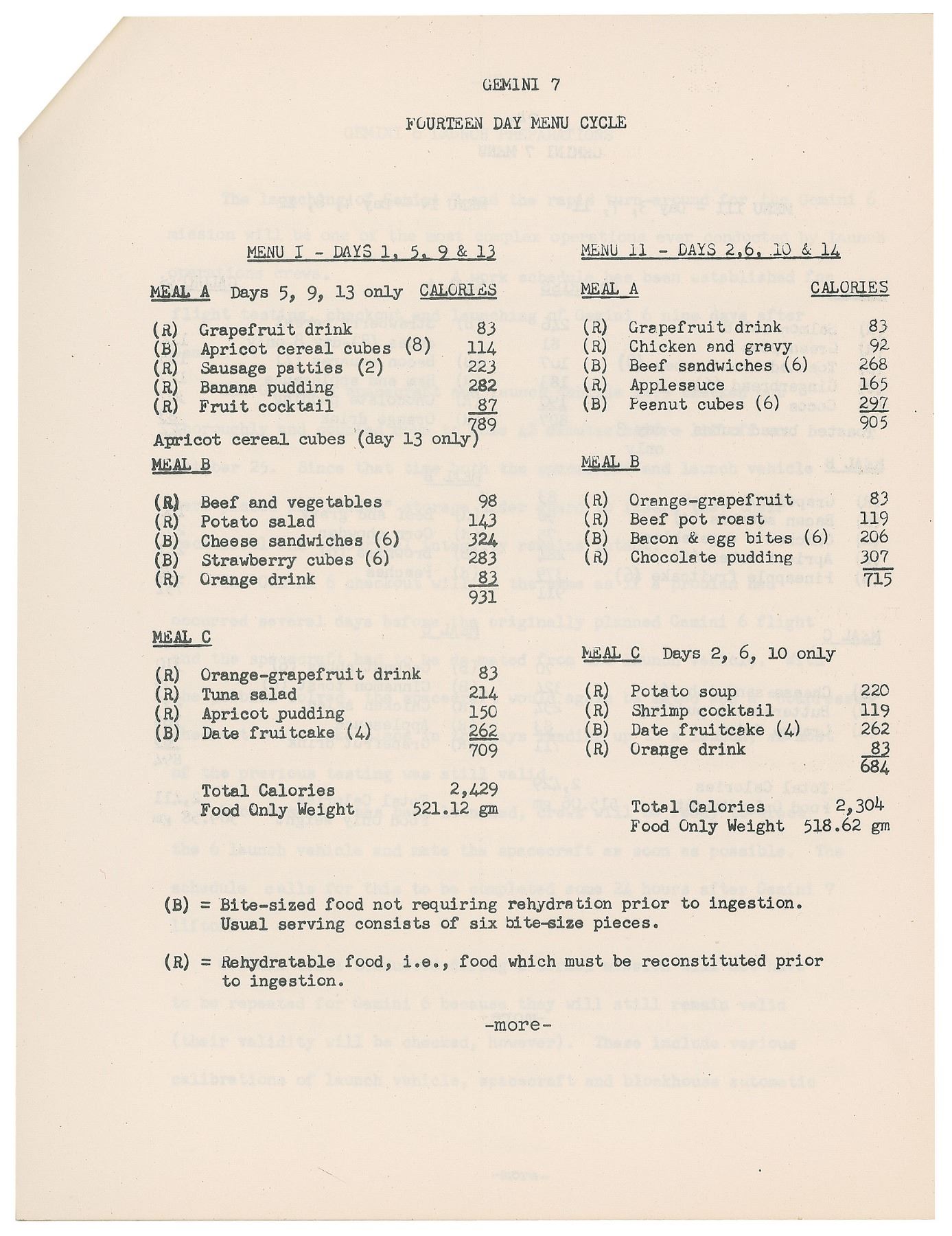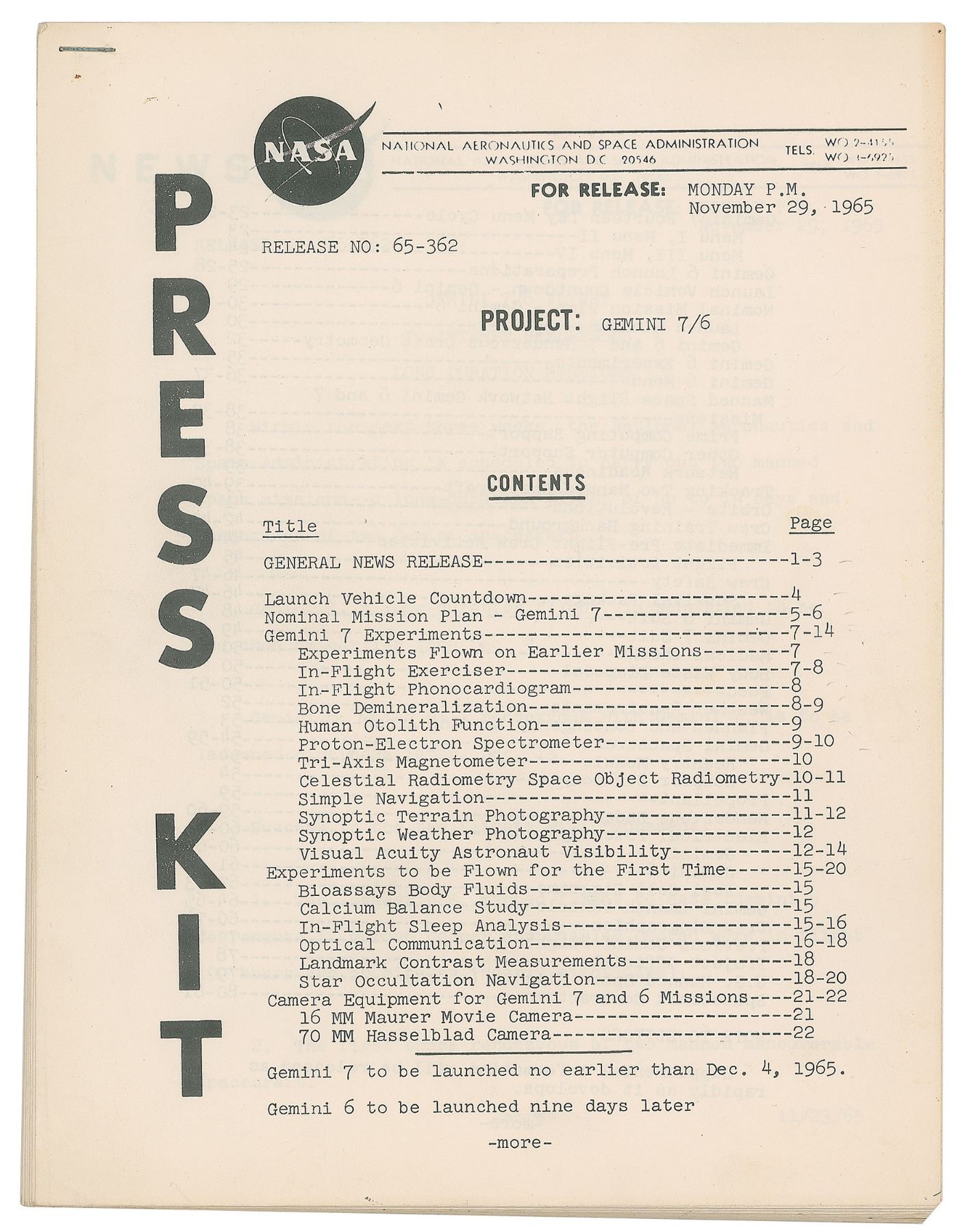 Original staple-bound NASA press kit for the Gemini 7 mission, Release No. 65–362, dated November 29, 1965, 81 pages, 8 x 10.5, with sections including: General News Release, Launch Vehicle Countdown, Nominal Mission Plan—Gemini 7, Gemini 7 Experiments, Experiments to be Flown for the First Time, Camera Equipment for Gemini 7 and 6 Missions, Gemini 7 Fourteen Day Menu Cycle, Gemini 6 Launch Preparations, Launch Vehicle Countdown—Gemini 6, Nominal Mission Plan—Gemini 6, Gemini 6 Experiments, Gemini 6 Menu, Manned Space Flight Network Gemini 6 and 7, Tracking Two Manned Spacecraft, Orbits—Revolutions, Crew Training Background, Immediate Pre-Flight Crew Activities, Crew Safety, Gemini 6 Suit, Gemini 7 Suit, Medical Checks, Body Waste Disposal, Food, Weather Requirements, Planned and Contingency Landing Areas, Gemini Spacecraft, Propellant, Rendezvous Radar, Electrical Power Systems, Gemini Launch Vehicle, Crew Biographies, Previous Gemini Flights, Project Officials, U.S. Manned Space Flights, and Spacecraft Contractors. In fine condition.