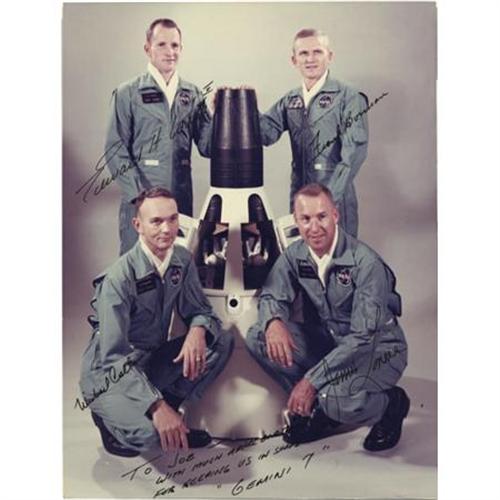 <B>Gemini 7 Signed Color Prime Crew & Back-Up Crew Photograph, </B></I> 7.25" x 9.5", inscribed "<I>Edward H. White II/ To Joe-/ With much appreciation/ for keeping us in shape-/ 'Gemini 7',</B></I>" also signed "<I>Frank Borman,</B></I>" "<I>Michael Collins,</B></I>" and "<I>James Lovell.</B></I>" Mounting remnants on verso. Borman and Lovell flew aboard Gemini 7 (1965). Ed White was killed in the Apollo 1 fire in 1967. <I>From the collection of renowned former physical trainer of the astronauts Joe Garino. This lot is accompanied by a signed certificate of authentication from Garino verifying its provenance.</B></I><BR><BR><b>Shipping:</b> Flat Material, Small (<a target="_blank" href="http://www.heritageauctions.com/common/shipping.php">view shipping information</a>)