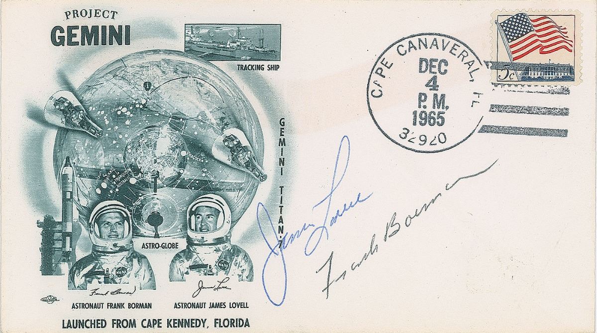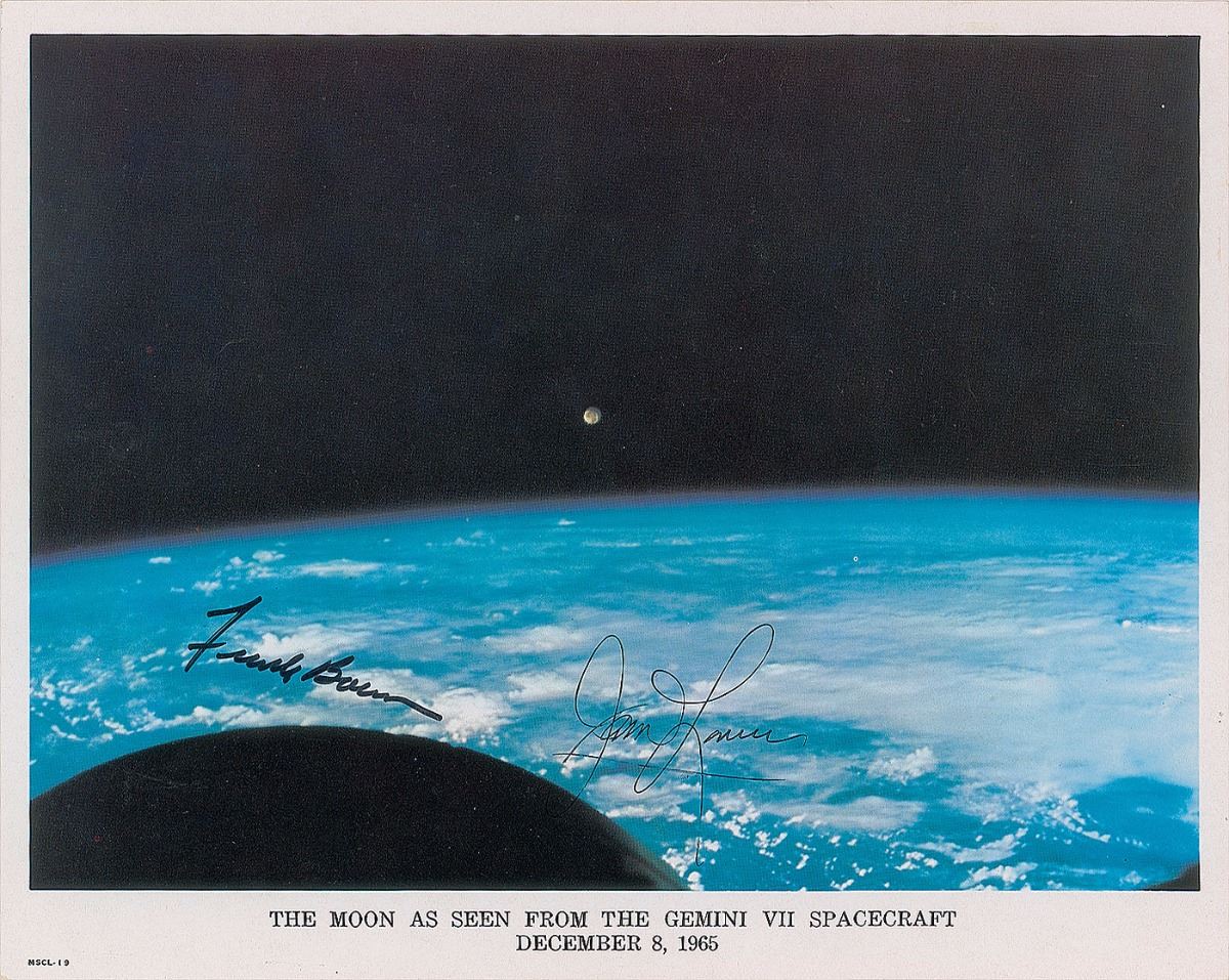 Two items: a Gemini 7 launch day cover with a cachet honoring the mission, signed in blue and black ballpoint by James Lovell and Frank Borman; and a desirable official color 10 x 8 NASA lithograph of the moon as seen from the Gemini 7 spacecraft, signed in black ink by both Lovell and Borman. In overall fine condition, with mild show-through from toned envelope adhesive to the cover. From the collection of aerospace memorabilia specialist Ken Havekotte.