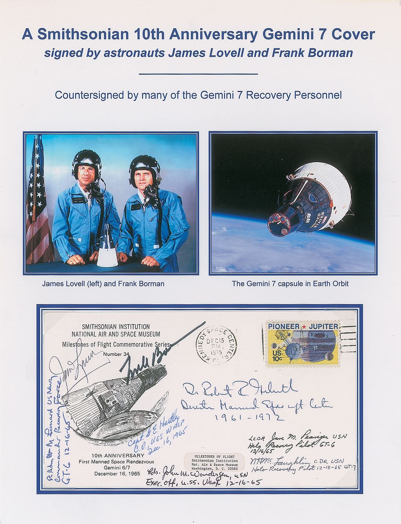 Smithsonian Institution commemorative cover with a cachet honoring the 10th anniversary of the first manned space rendezvous between the Gemini 6 and 7 capsules, postmarked at Kennedy Space Center on December 15, 1965, the launch date of Gemini 6, signed in black ballpoint by James Lovell and in black felt tip by Frank Borman. The cover is also signed by six recovery personnel from the two Gemini missions. Removably corner-mounted to a color 8.5 x 11 presentation sheet. In fine condition.