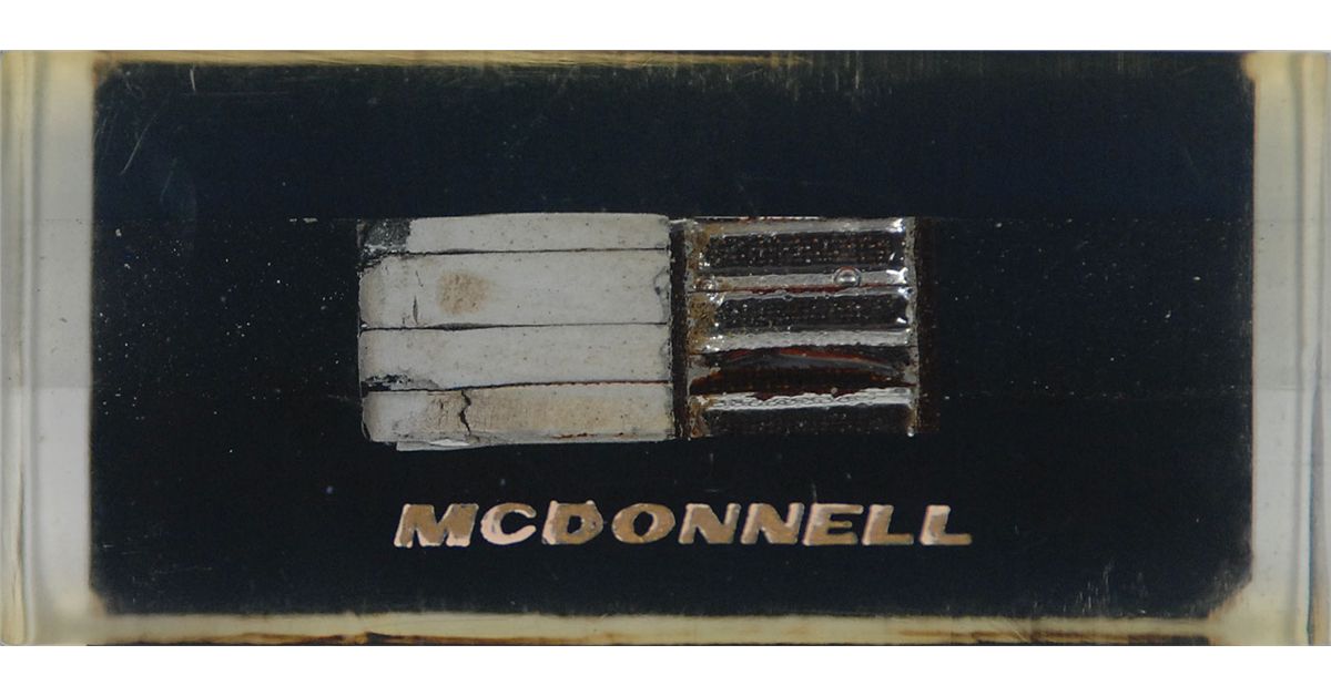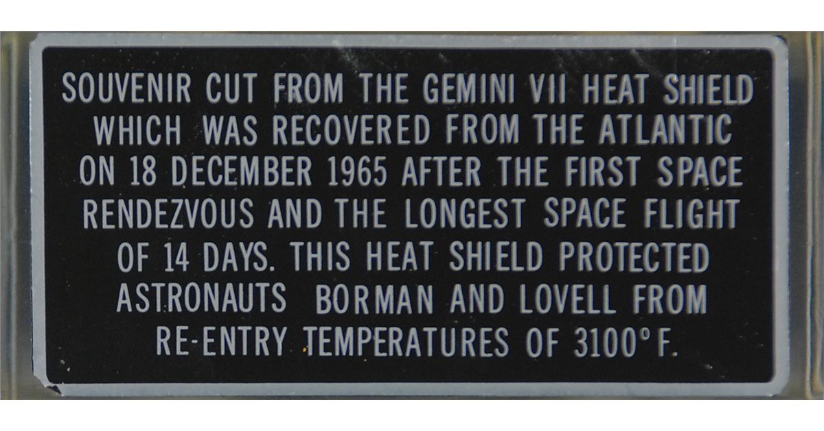 Flown heat shield fragment from the Gemini 7 spacecraft which protected the astronauts from the reentry temperatures of up to 3100 degrees. The fragment measures approximately 1.5 x .5 x .5, and is encased in a 3.75 x 1.75 x 1.75 block of Lucite labeled “McDonnell,” bearing a descriptive plaque on the back. In fine condition.