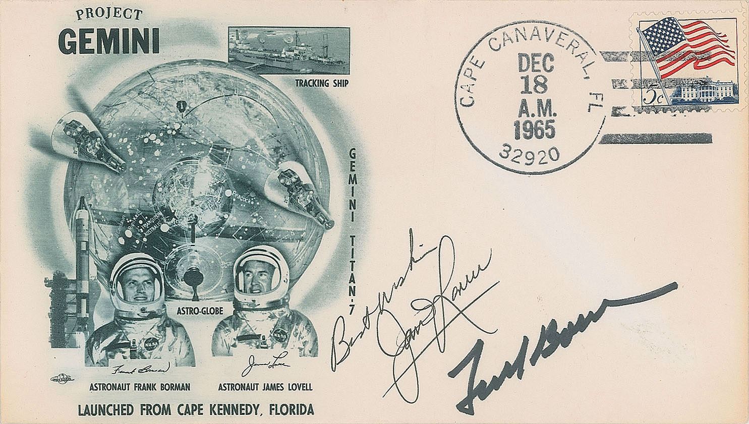 Recovery cover with a cachet commemorating the Gemini 7 mission, postmarked at Cape Canaveral on November 18, 1966, signed in black ballpoint, "Best wishes, James Lovell," and black felt tip, "Frank Borman." In fine condition.