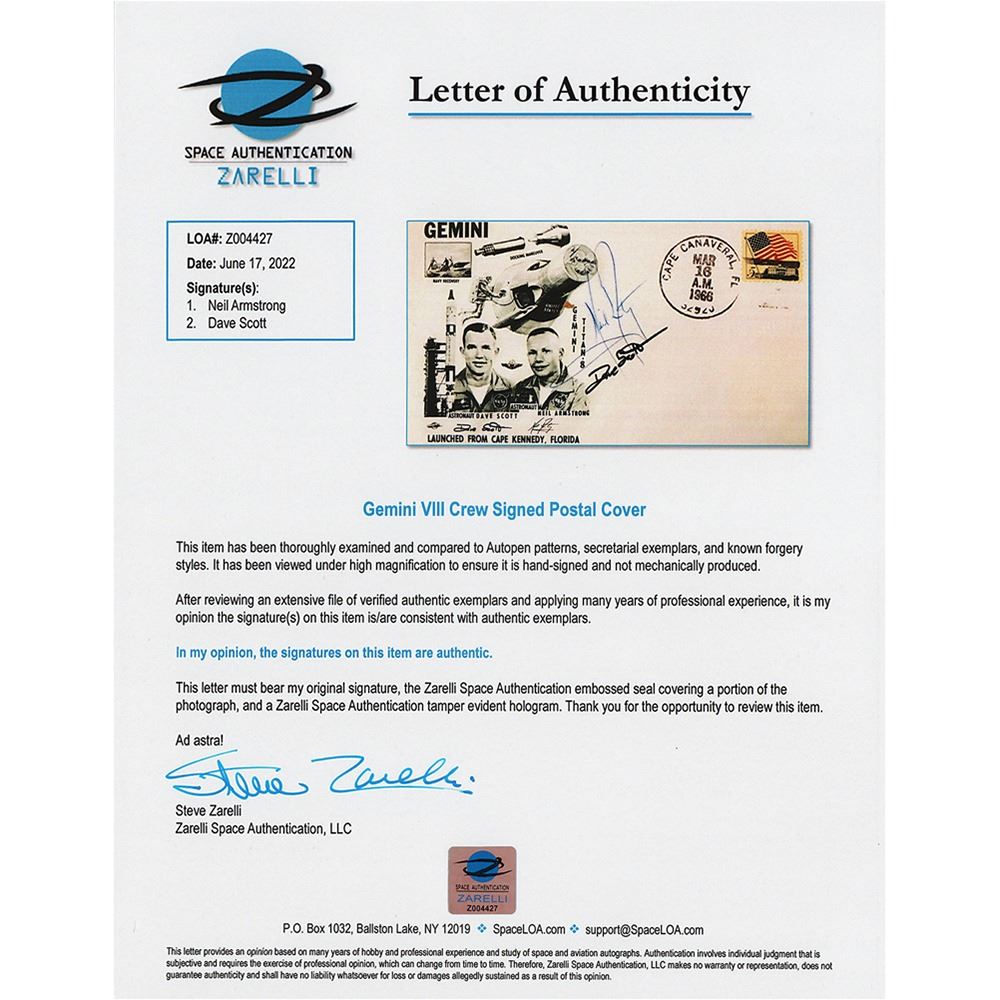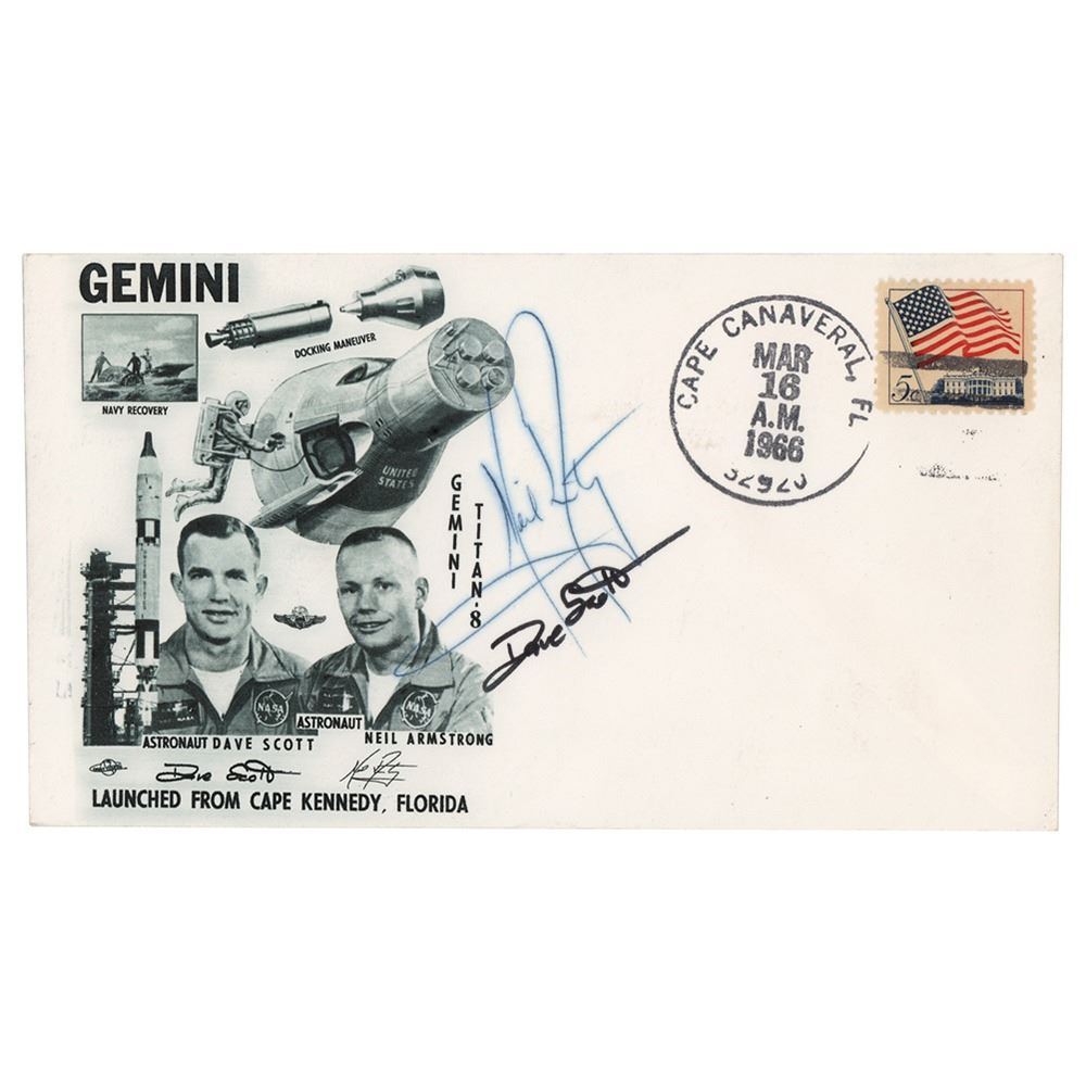 Sought-after Gemini 8 launch day cover with a cachet honoring the historic mission which saw the first docking of two spacecraft in orbit, postmarked at Cape Canaveral on March 16, 1966, signed in blue ballpoint by Neil Armstrong and in black felt tip by Dave Scott. In very fine condition, with very faint haloing to Armstrong's signature. Accompanied by a full letter of authenticity from Zarelli Space Authentication.