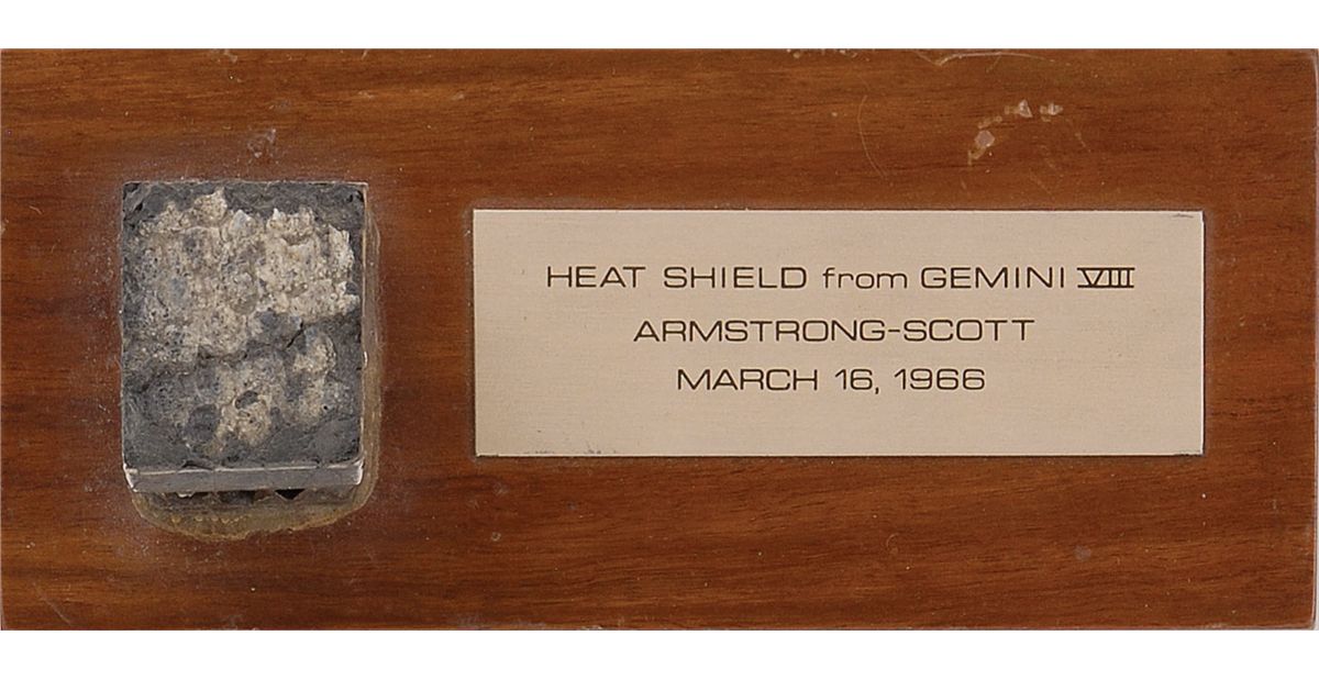Flown heat shield from the Gemini VIII space capsule. Shield fragment measures 1 x 1.75 x 1.25, with the upper portion charred and melted from the intense heat of re-entry. Fragment is affixed to a 5.5 x 2.5 wooden mount with a plaque that reads, “Heat shield from Gemini VIII, Armstrong–Scott, March 16, 1966.” In fine condition.