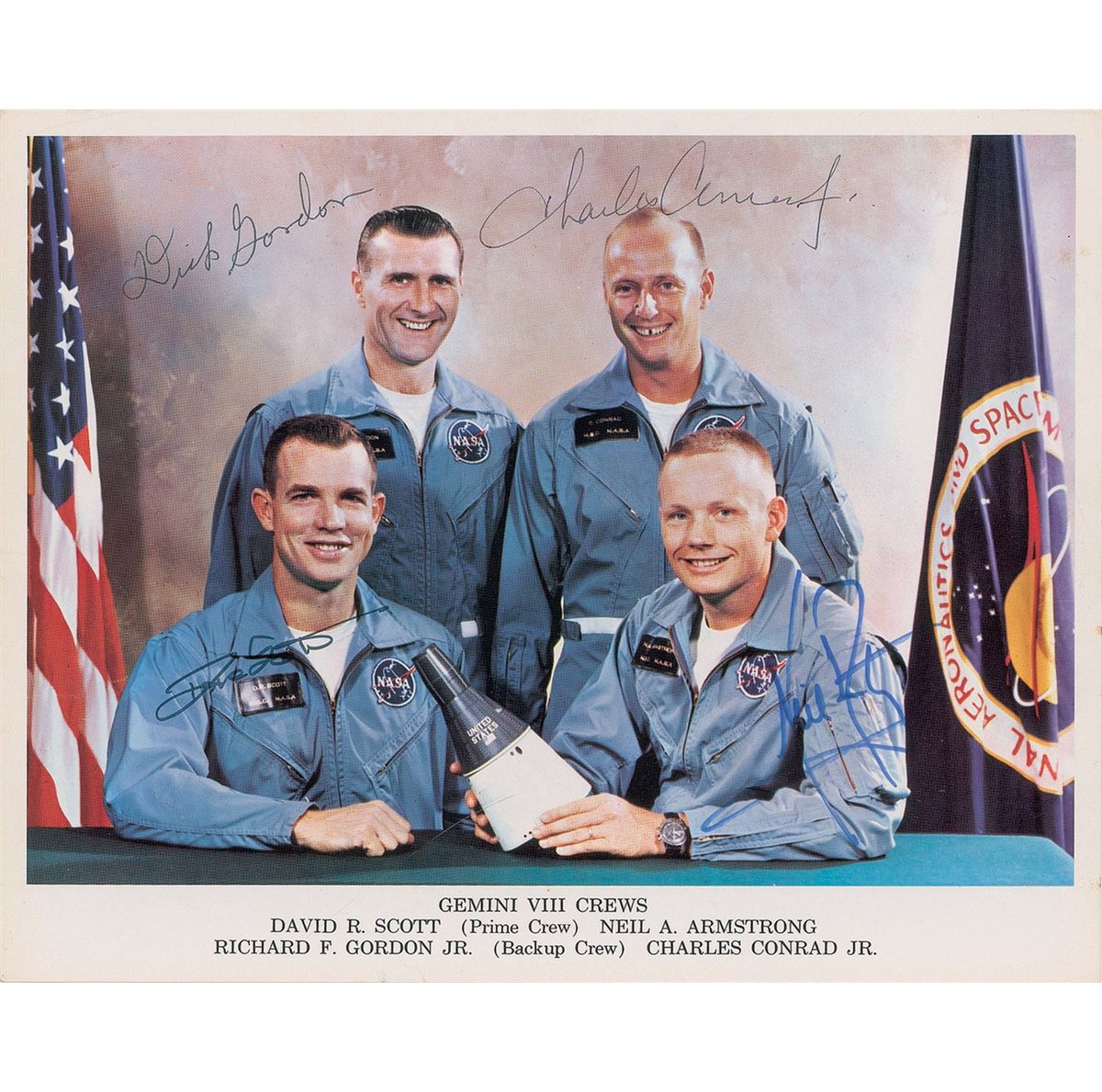 Color 10 x 8 NASA photo of the prime and backup crews of Gemini VIII, signed in blue felt tip by Neil Armstrong, in black felt tip by Dave Scott and in ballpoint by Dick Gordon and Charles Conrad. In fine condition, with a few dings and edge creases to top left corner. Gemini VIII completed the world's first orbital docking. What followed the successful docking by Armstrong were some of the most hair-raising few minutes in space-program history. The Gemini VIII capsule, still docked to the Agena, began rolling continuously. Never having faced this in simulation, the crew undocked from the Agena. The problem was a stuck thruster on the spacecraft, which now tumbled even faster at the dizzying rate of one revolution per second. The only way to stop the motion was to use the capsule's reentry control thrusters, which meant that Armstrong and Scott had to cut short their mission and make an emergency return to Earth 10 hours after launch. They were still nauseated after splashdown, as well as disappointed: Scott had missed out on the planned space-walk.