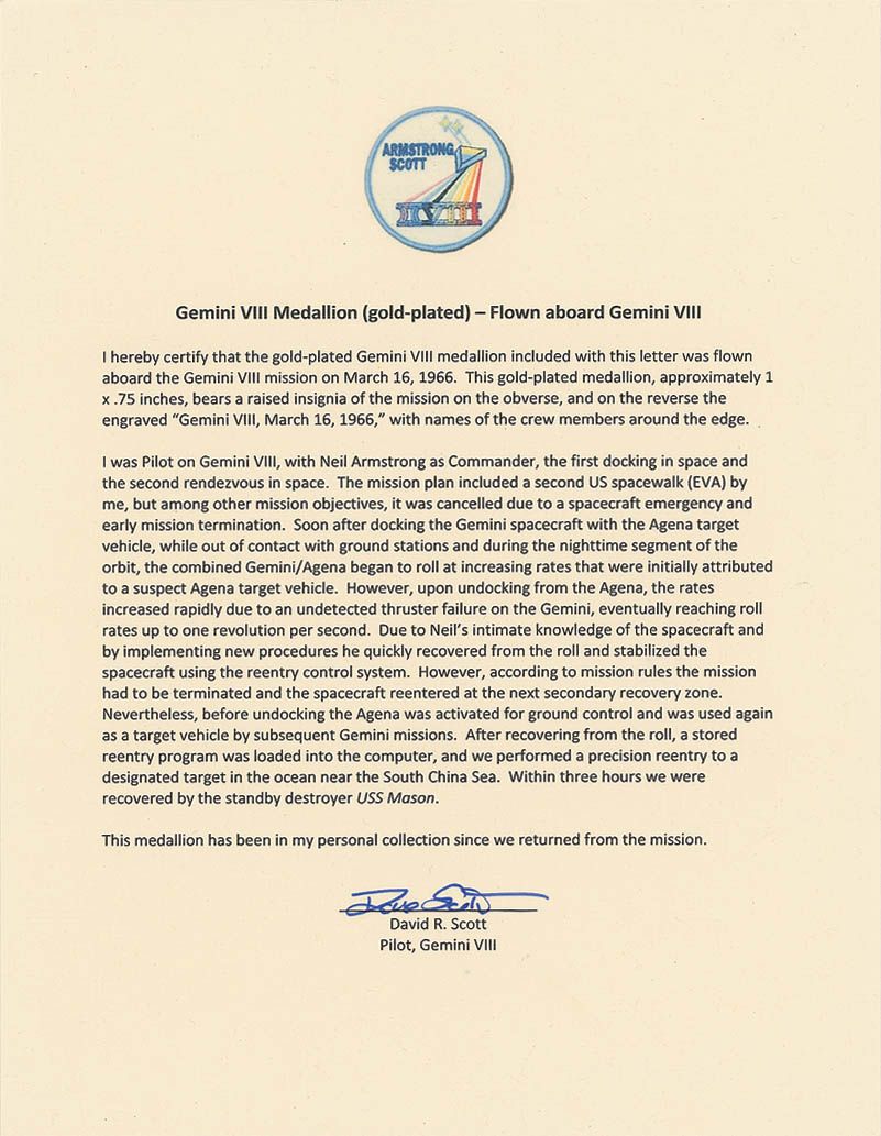 Flown gold-plated Fliteline medallion, approximately one inch in diameter, flown aboard the Gemini 8 mission. One side bears a raised insignia of the mission, with reverse engraved “First to dock in space. 16, March, 1966.” Accompanied by a letter of authenticity from Dave Scott which reads, in part: “I hereby certify that the gold-plated Gemini VIII medallion included with this letter was flown aboard the Gemini VIII mission…This medallion has been in my personal collection since we returned from the mission.” Condition is mint state. Gemini VIII completed the world's first orbital docking. What followed the successful docking by Armstrong were some of the most hair-raising few minutes in space-program history. The Gemini VIII capsule, still docked to the Agena, began rolling continuously. Never having faced this in simulation, the crew undocked from the Agena. The problem was a stuck thruster on the spacecraft, which now tumbled even faster at the dizzying rate of one revolution per second. The only way to stop the motion was to use the capsule's reentry control thrusters, which meant that Armstrong and Scott had to cut short their mission and make an emergency return to Earth 10 hours after launch. Provenance: Dave Scott.