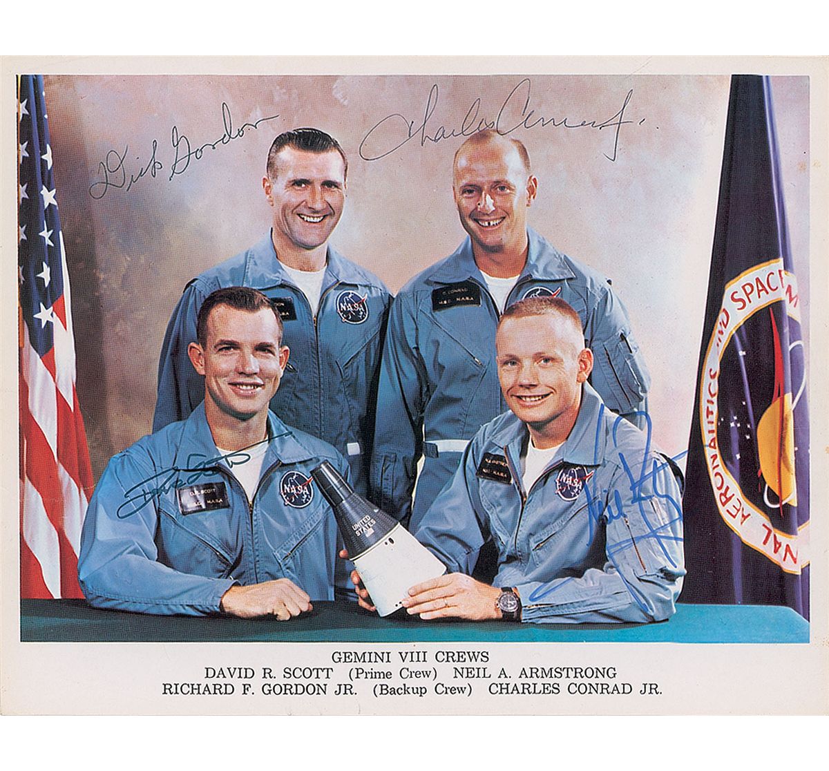 Color 10 x 8 NASA photo of the Gemini 8 primary and back-up crews, signed in blue felt tip, “Neil Armstrong”; black felt tip, “Dave Scott”; and black ballpoint, “Charles Conrad, Jr.”; and “Dick Gordon.” Creases to the left side and upper border, and some trivial foxing to the right border, otherwise fine condition.