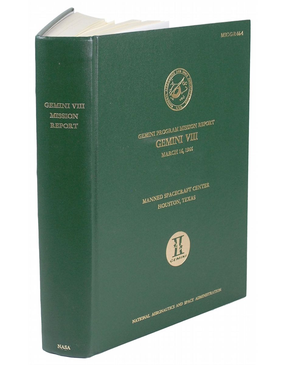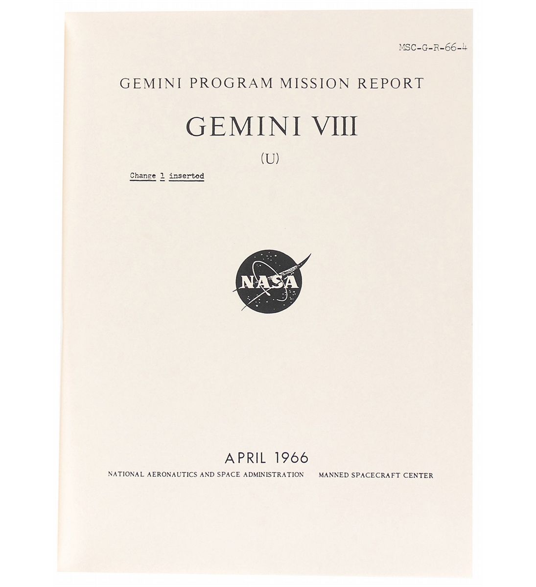 Hardbound NASA report entitled “Gemini Program Mission Report, Gemini VIII, March 16, 1966,” 8.75 x 11, over 300 pages in length, and numbered on the front cover MSC-G-R-66-4. Each page is labeled “unclassified,” and report features many pull-out charts and graphs. Subjects include: all aspects of vehicle performance, performance of mission support personnel, flight crew, discussion of aero-medical data, and in-flight experiments. In fine condition.