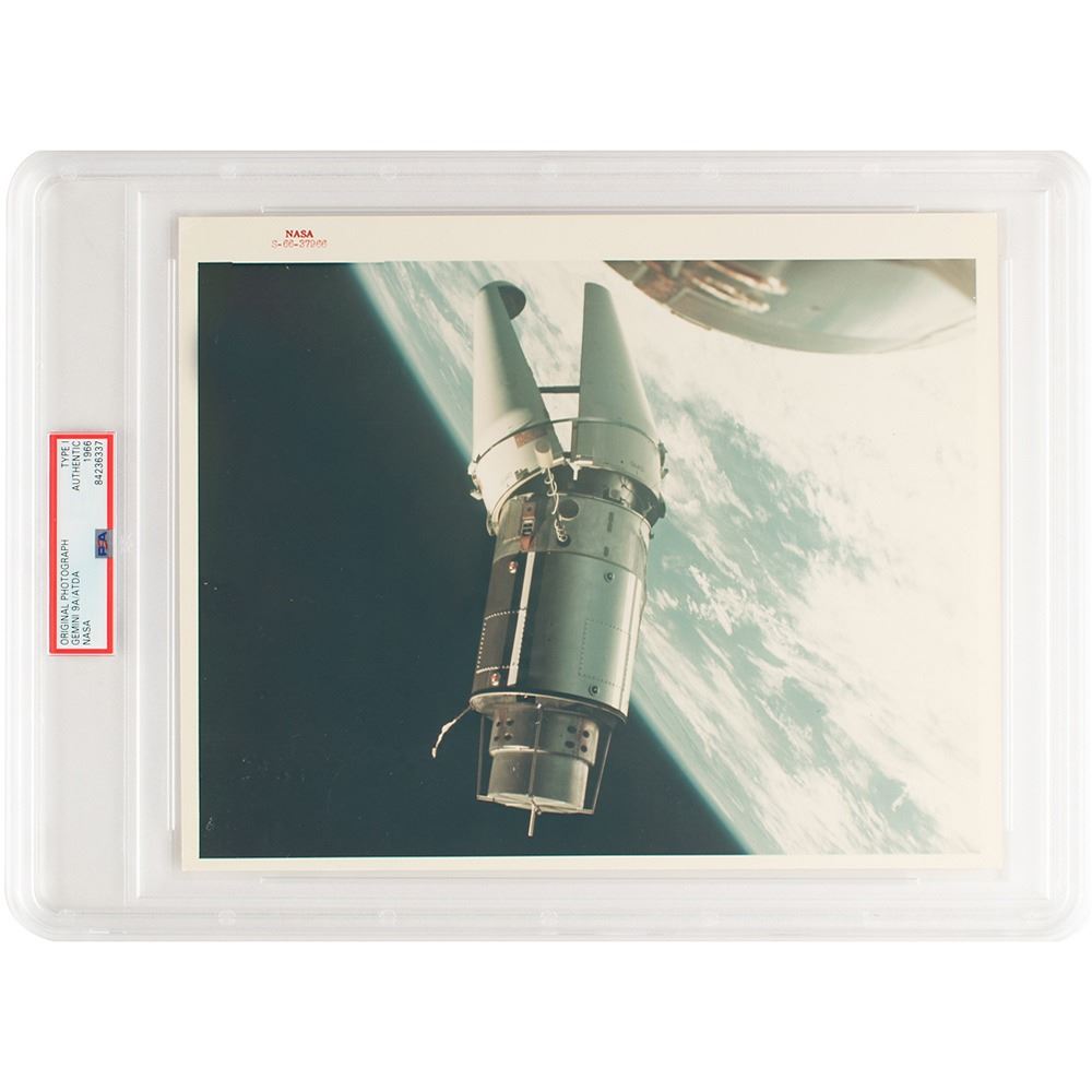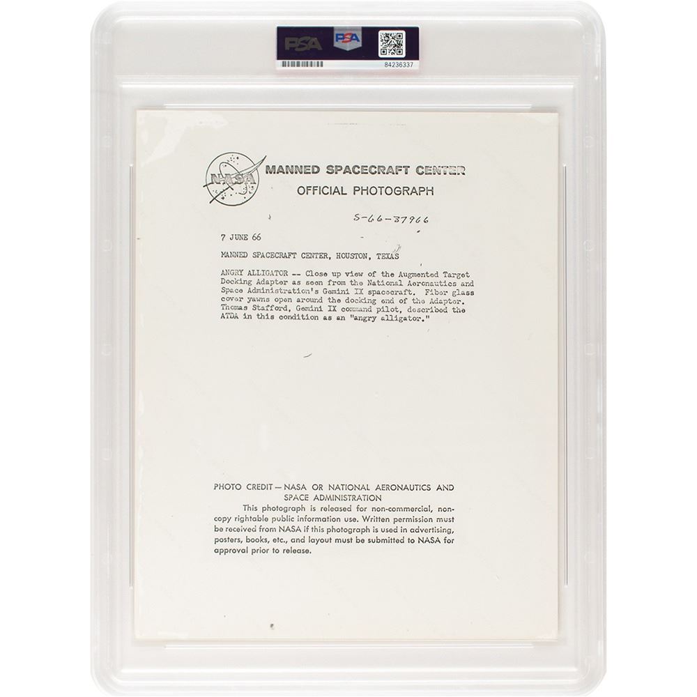 Official color glossy 10 x 8 red-numbered NASA photo (S-66-37966), which shows the Augmented Target Docking Adapter (ATDA) as seen from the Gemini-9 spacecraft, famously described by the crew as an 'Angry Alligator.' Reverse bears "A Kodak Paper" watermarks and black NASA caption text. In fine condition, with light rubbing to the emulsion over the spacecraft. Encapsulated by PSA as an authentic 'Type I' photograph. From The Gene Kranz Collection. Kranz served as flight director for all Project Gemini missions.