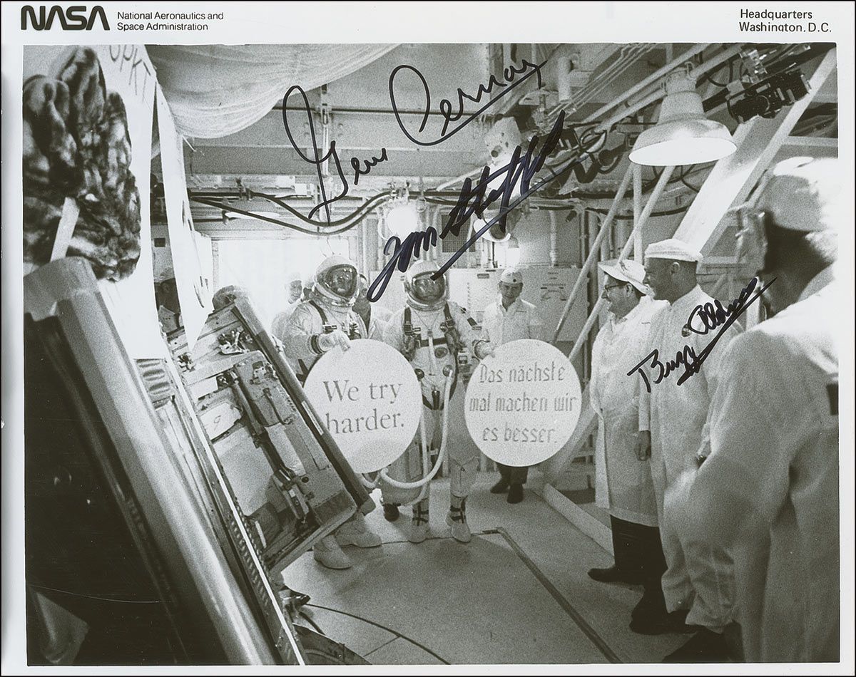 Color vintage glossy 10 x 8 photo of Gemini 9 crew members clowning around in the White Room before their postponed mission, with Buzz Aldrin standing by, signed later in black felt tip by Gene Cernan, Tom Stafford, and Buzz Aldrin. In fine condition.