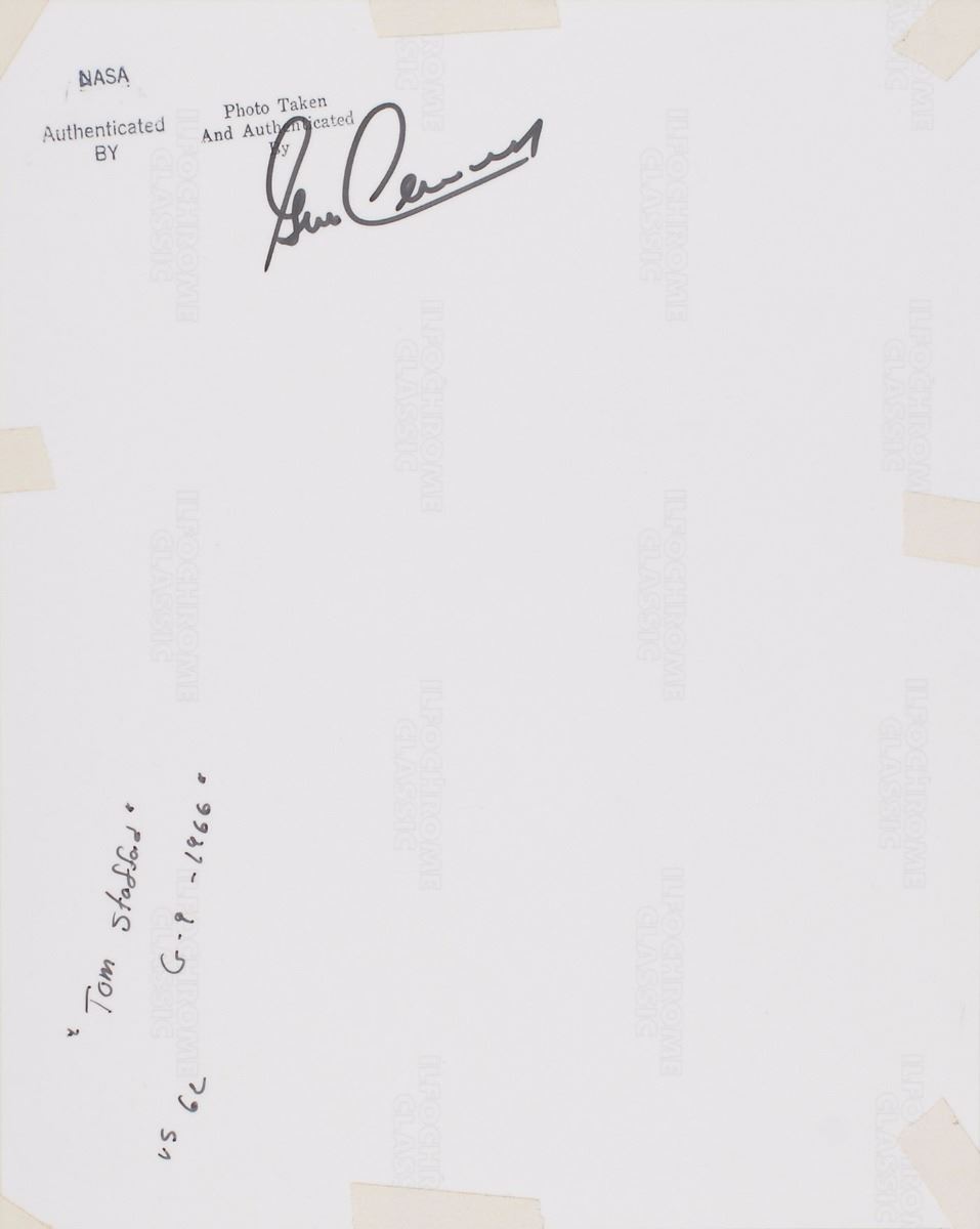 Color glossy 9.25 x 7.25 photo of command pilot Tom Stafford in the Gemini spacecraft, matted to an overall size of 16 x 20, signed on the mat in black ink by Gene Cernan. Reverse of photo bears a NASA authenticity stamp, “Photo taken and authenticated by,” and is signed underneath in black felt tip by Cernan. In fine condition, with a tiny slice to the mat touching a single letter of the front signature.