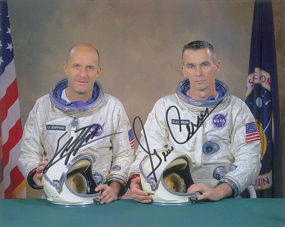 Color semi-glossy 10 x 8 paperstock photo of the Gemini 9 crew wearing their space suits, signed in black felt tip, "Stafford" and "Gene Cernan." In fine condition.