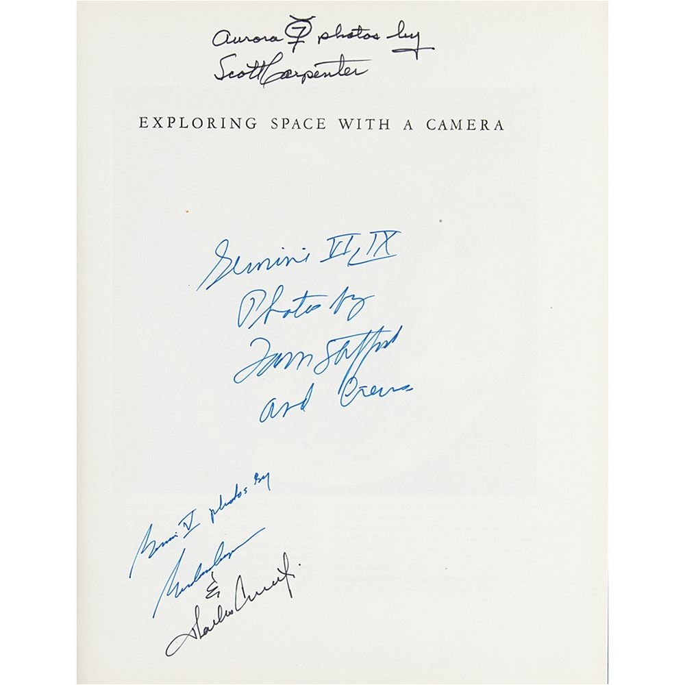 Signed book: Exploring Space with a Camera. First edition. Washington, DC: NASA, 1968. Hardcover, 9.5 x 11.75, 214 pages. Signed on the half-title page in felt tip by four Mercury and Gemini astronauts: "Aurora 7 photos by Scott Carpenter," "Gemini VI and IX photos by Tom Stafford and Crews," "Gemini V photos by Gordon Cooper," and "& Charles Conrad, Jr." In fine condition. A fantastic multi-signed volume chronicling the breathtaking photography of the early manned space program.