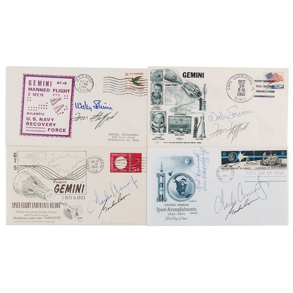 Four covers signed by Gemini astronauts: a Gemini 5 launch day cover, signed in ink by Charles Conrad and Gordon Cooper; a first day cover honoring United States space accomplishments, signed in ink by Charles Conrad, Gordon Cooper, and GT-5 recovery helicopter pilot Fred Highsmith; a Gemini 6 launch day cover, signed in ballpoint by Wally Schirra and Tom Stafford; and a Gemini 6 recovery cover, signed in felt tip by Wally Schirra and Tom Stafford. In fine condition.