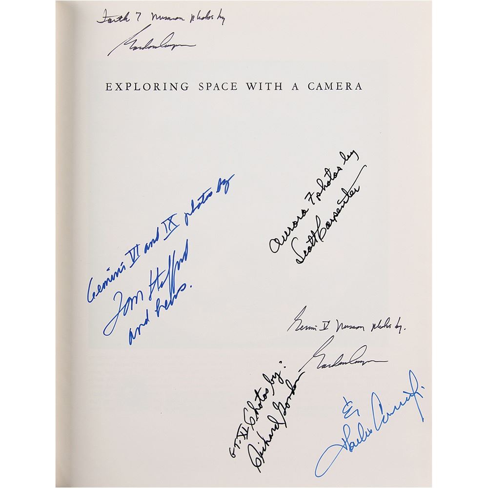 Signed book: Exploring Space with a Camera. First edition. Washington, DC: NASA, 1968. Hardcover, 9.5 x 11.75, 214 pages. Signed on the half-title page in felt tip by five Mercury and Gemini astronauts, with Cooper signing twice: "Aurora 7 photos by Scott Carpenter," "Faith 7 mission photos by Gordon Cooper," "Gemini V mission photos by Gordon Cooper," "Gemini VI and IX photos by Tom Stafford and Crews," "GT-XI Photos by Richard Gordon," and "& Charles Conrad, Jr." In fine condition, with light wear and staining to the covers. A fantastic multi-signed volume chronicling the breathtaking photography of the early manned space program.
