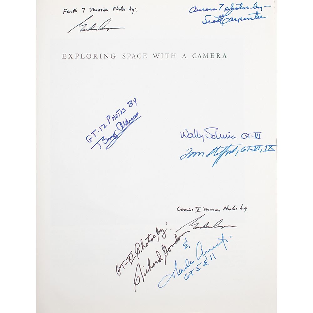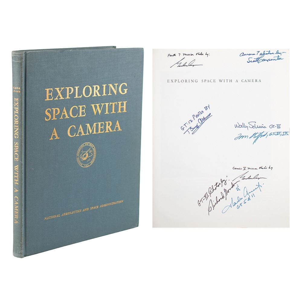 Signed book: Exploring Space with a Camera. First edition. Washington, DC: NASA, 1968. Hardcover, 9.5 x 11.75, 214 pages. Signed on the half-title page in felt tip by seven Gemini astronauts, with Cooper signing twice: "Aurora 7 photos by Scott Carpenter," "Faith 7 mission photos by Gordon Cooper," "Gemini V mission photos by Gordon Cooper," "Wally Schirra, GT-VI," "Tom Stafford, GT-VI, IX," "GT-XI Photos by Richard Gordon," and "& Charles Conrad, Jr., GT 5 & 11," "GT-12 Photos by Buzz Aldrin." In fine condition, with light wear to the covers. A fantastic multi-signed volume chronicling the breathtaking photography of the early manned space program.