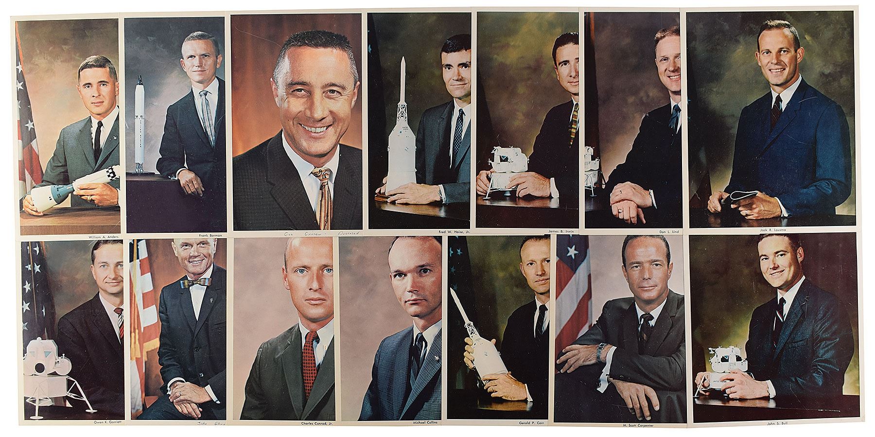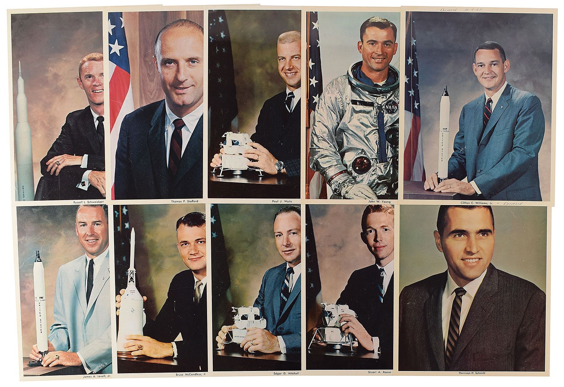 Collection of 24 unsigned official color 8 x 10 NASA lithographs of notable astronauts, including: Bill Anders, Frank Borman, John S. Bull, Scott Carpenter, Jerry Carr, Michael Collins, Charles Conrad, Owen Garriott, John Glenn, Gus Grissom, Fred Haise, Jim Irwin, Don Lind, Jack Lousma, James Lovell, Bruce McCandless II, Edgar Mitchell, Stuart Roosa, Harrison Schmitt, Rusty Schweickart, Tom Stafford, Paul Weitz, Clifton Williams, and John Young. The John Young photo has scuffing to its upper right background area, and borders of the Glenn, Grissom, and Williams photos bear collector notations, otherwise all of the photos are in very fine condition.