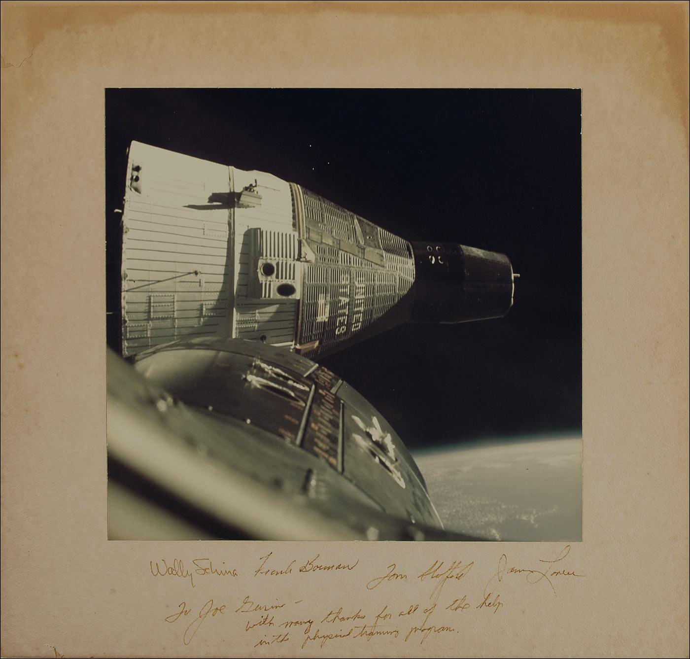 Breathtaking color 13.75 x 11 NASA photo of the in-orbit rendezvous of the Gemini 6 and 7 capsules, affixed to a 20 x 16 mount, and signed in the lower border of the mount in black felt tip by astronauts Wally Schirra, Frank Borman, Tom Stafford, and James Lovell, with Stafford adding an inscription to the astronaut’s conditioning trainer, “To Joe Garino—With many thanks for all of the help with the physical training program.” All signatures and inscription a shade or two light, but completely legible, toning to top portion of mount, and a small tear to top left, otherwise fine condition. Pre-certified Scott Cornish and RRAuction COA.